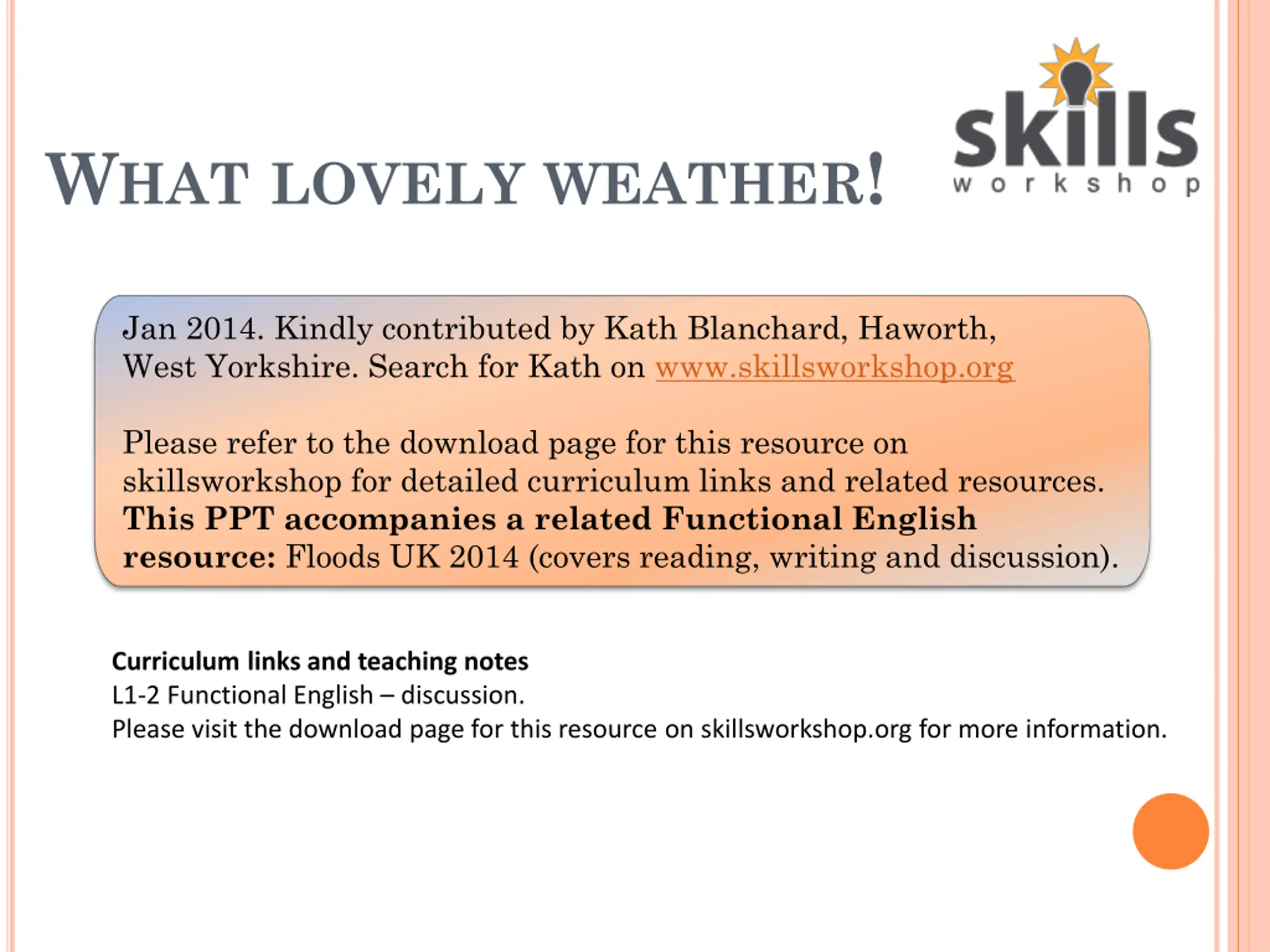 Description: swlogo WHAT LOVELY WEATHER! Jan 2014. Kindly contributed by Kath Blanchard, Haworth, West Yorkshire. Search for Kath on www.skillsworkshop.org Please refer to the download page for this resource on skillsworkshop for detailed curriculum links and related resources. This PPT accompanies a related Functional English resource: Floods UK 2014 (covers reading, writing and discussion). Curriculum links and teaching notes L1-2 Functional English discussion. Please visit the download page for this resource on skillsworkshop.org for more information.