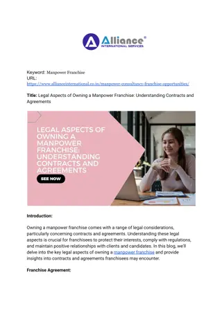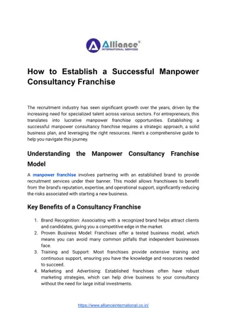 As you fabricate a strong client base and notoriety, you can reinvest in your business to grow administrations, employ extra staff, and increment your market reach. This versatility permits you to develop your business at your own speed while keeping up with command over your activities. End Putting resources into manpower franchise opportunities and potential open doors offers business people a way to long haul development by entering a popular industry with a demonstrated plan of action. With solid industry interest, the support of a laid out brand, and the capacity to scale your business, a labor establishment is a sound venture. By zeroing in on client connections, remaining refreshed on industry patterns, and utilizing innovation, you can expand your prosperity and position your business for supported productivity in the staffing business. Alliance Recruitment Agency: Your Global Manpower Agency Alliance Recruitment Agency is a leading global manpower agency, offering exceptional manpower franchise opportunities to entrepreneurs worldwide. With a vast network of skilled professionals across various industries, we provide comprehensive staffing solutions to businesses seeking top talent. Our franchise model allows partners to leverage our expertise and brand reputation while delivering high-quality recruitment services in their local markets. Whether you're looking to start a franchise or need help with recruitment, we're here to assist. Contact us today to explore how Alliance can help you succeed in the manpower industry. View Source - https://allianceinternationalservices.medium.com/low- cost-manpower-franchise-opportunities-c8a39b6f43e2 www.alliancerecruitmentagency.com