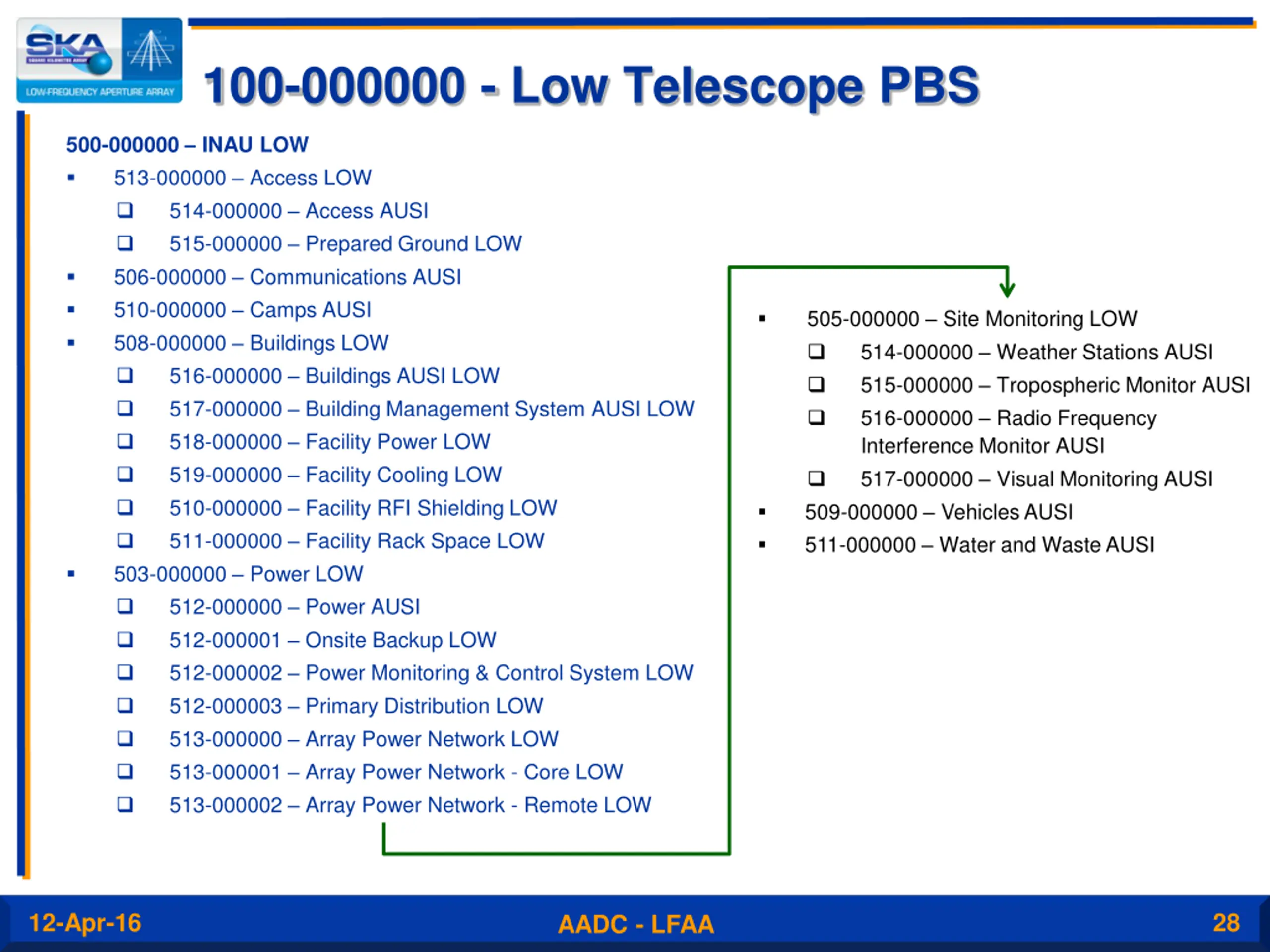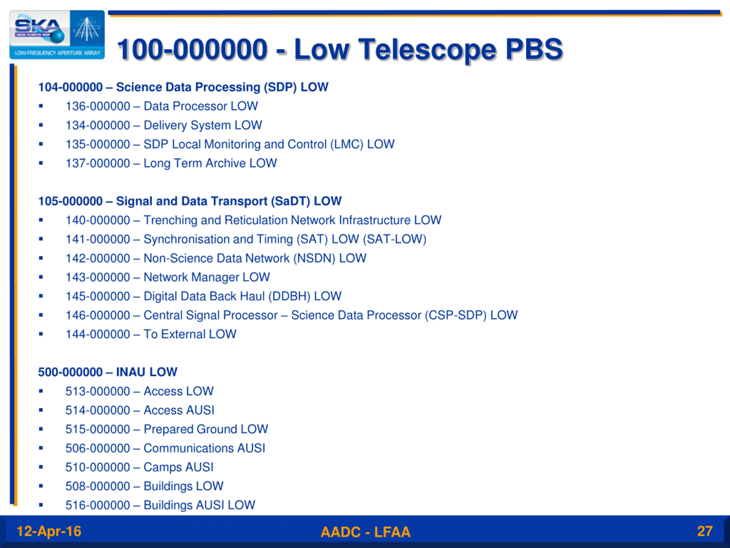 100-000000 - Low Telescope PBS 104-000000 Science Data Processing (SDP) LOW 136-000000 Data Processor LOW 134-000000 Delivery System LOW 135-000000 SDP Local Monitoring and Control (LMC) LOW 137-000000 Long Term Archive LOW 105-000000 Signal and Data Transport (SaDT) LOW 140-000000 Trenching and Reticulation Network Infrastructure LOW 141-000000 Synchronisation and Timing (SAT) LOW (SAT-LOW) 142-000000 Non-Science Data Network (NSDN) LOW 143-000000 Network Manager LOW 145-000000 Digital Data Back Haul (DDBH) LOW 146-000000 Central Signal Processor Science Data Processor (CSP-SDP) LOW 144-000000 To External LOW 500-000000 INAU LOW 513-000000 Access LOW 514-000000 Access AUSI 515-000000 Prepared Ground LOW 506-000000 Communications AUSI 510-000000 Camps AUSI 508-000000 Buildings LOW 516-000000 Buildings AUSI LOW 12-Apr-16 27 AADC - LFAA