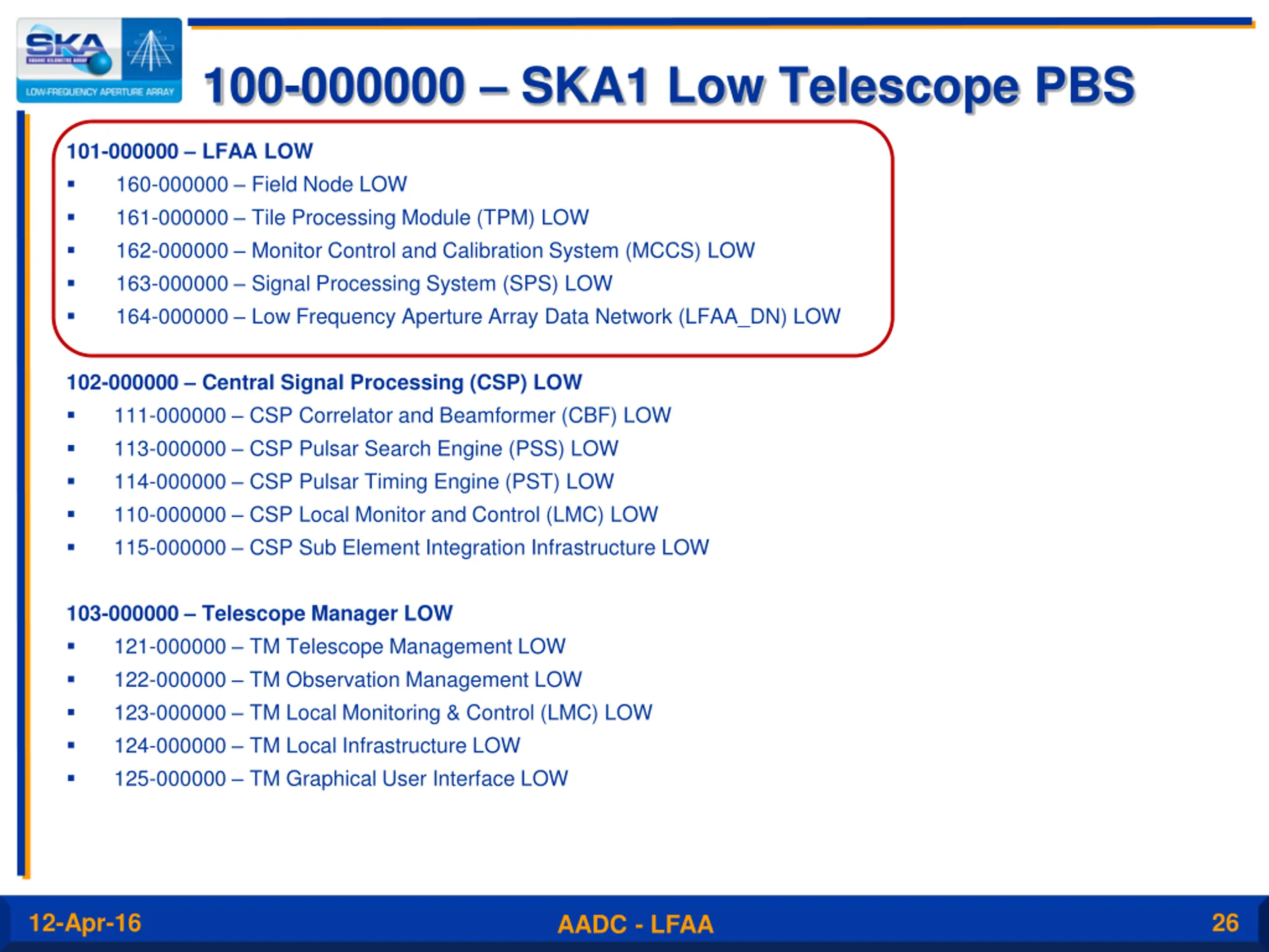 100-000000 SKA1 Low Telescope PBS 101-000000 LFAA LOW 160-000000 Field Node LOW 161-000000 Tile Processing Module (TPM) LOW 162-000000 Monitor Control and Calibration System (MCCS) LOW 163-000000 Signal Processing System (SPS) LOW 164-000000 Low Frequency Aperture Array Data Network (LFAA_DN) LOW 102-000000 Central Signal Processing (CSP) LOW 111-000000 CSP Correlator and Beamformer (CBF) LOW 113-000000 CSP Pulsar Search Engine (PSS) LOW 114-000000 CSP Pulsar Timing Engine (PST) LOW 110-000000 CSP Local Monitor and Control (LMC) LOW 115-000000 CSP Sub Element Integration Infrastructure LOW 103-000000 Telescope Manager LOW 121-000000 TM Telescope Management LOW 122-000000 TM Observation Management LOW 123-000000 TM Local Monitoring & Control (LMC) LOW 124-000000 TM Local Infrastructure LOW 125-000000 TM Graphical User Interface LOW 12-Apr-16 26 AADC - LFAA