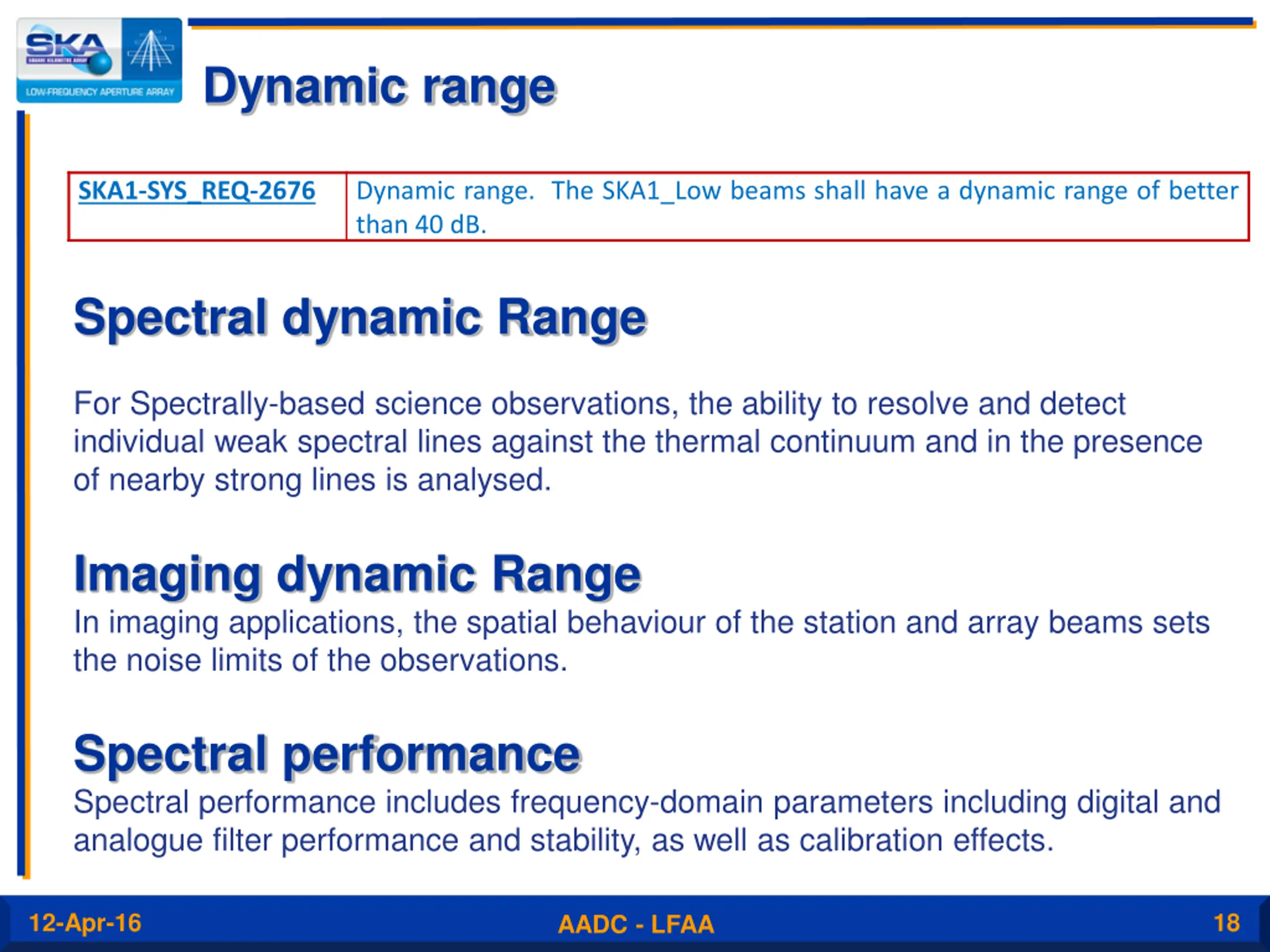 Dynamic range SKA1-SYS_REQ-2676 Dynamic range. The SKA1_Low beams shall have a dynamic range of better than 40 dB. Spectral dynamic Range For Spectrally-based science observations, the ability to resolve and detect individual weak spectral lines against the thermal continuum and in the presence of nearby strong lines is analysed. Imaging dynamic Range In imaging applications, the spatial behaviour of the station and array beams sets the noise limits of the observations. Spectral performance Spectral performance includes frequency-domain parameters including digital and analogue filter performance and stability, as well as calibration effects. 12-Apr-16 18 AADC - LFAA