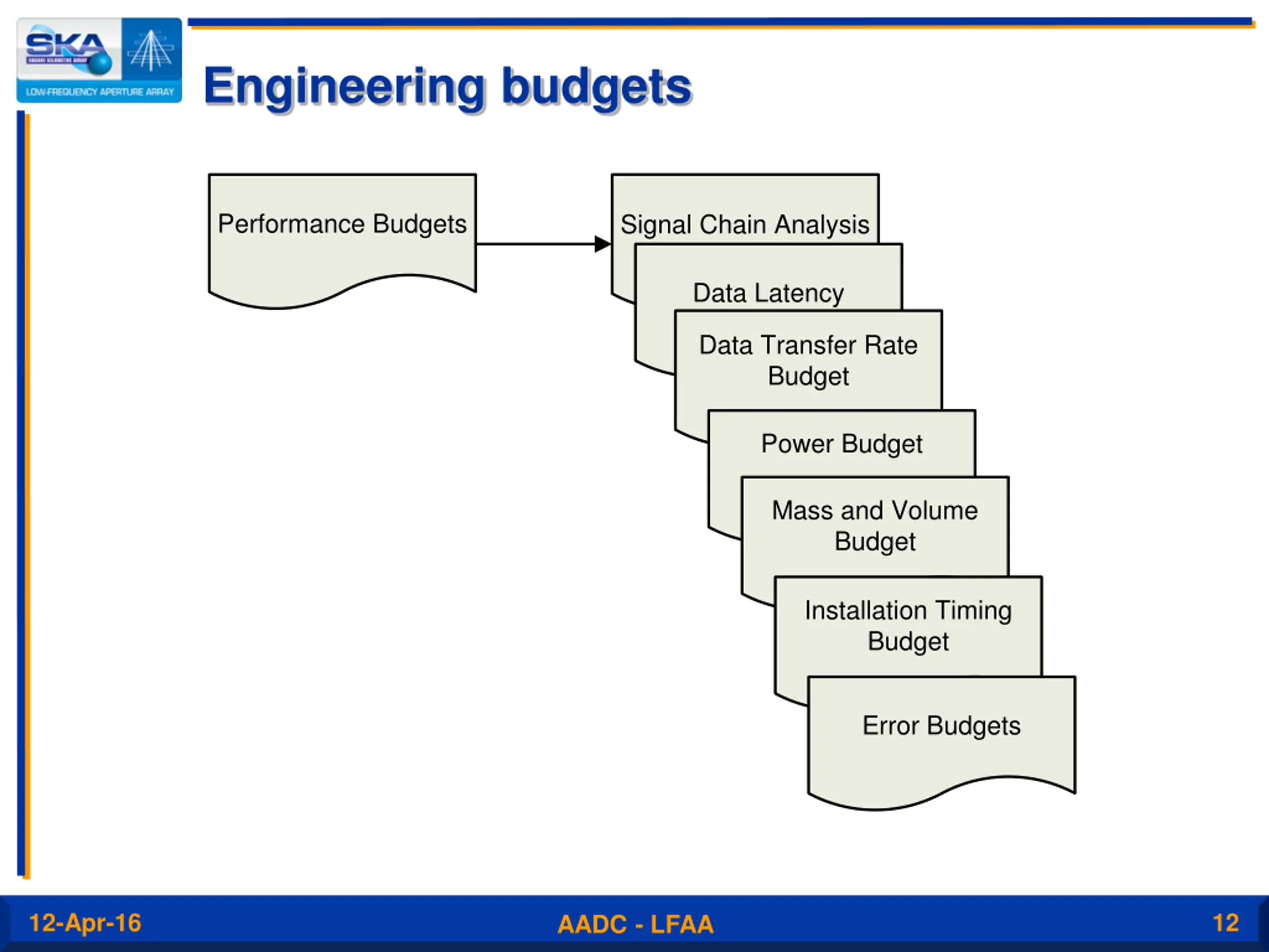 Engineering budgets Performance Budgets Signal Chain Analysis Data Latency Data Transfer Rate Budget Power Budget Mass and Volume Budget Installation Timing Budget Error Budgets 12-Apr-16 12 AADC - LFAA