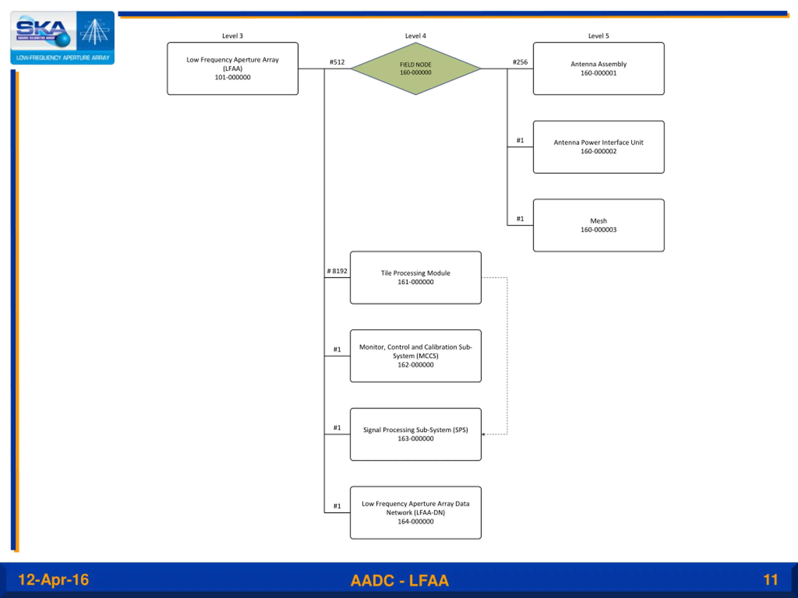 Level 3 Level 4 Level 5 Low Frequency Aperture Array (LFAA) 101-000000 #512 #256 Antenna Assembly 160-000001 FIELD NODE 160-000000 #1 Antenna Power Interface Unit 160-000002 #1 Mesh 160-000003 # 8192 Tile Processing Module 161-000000 Monitor, Control and Calibration Sub- System (MCCS) 162-000000 #1 #1 Signal Processing Sub-System (SPS) 163-000000 Low Frequency Aperture Array Data Network (LFAA-DN) 164-000000 #1 12-Apr-16 11 AADC - LFAA