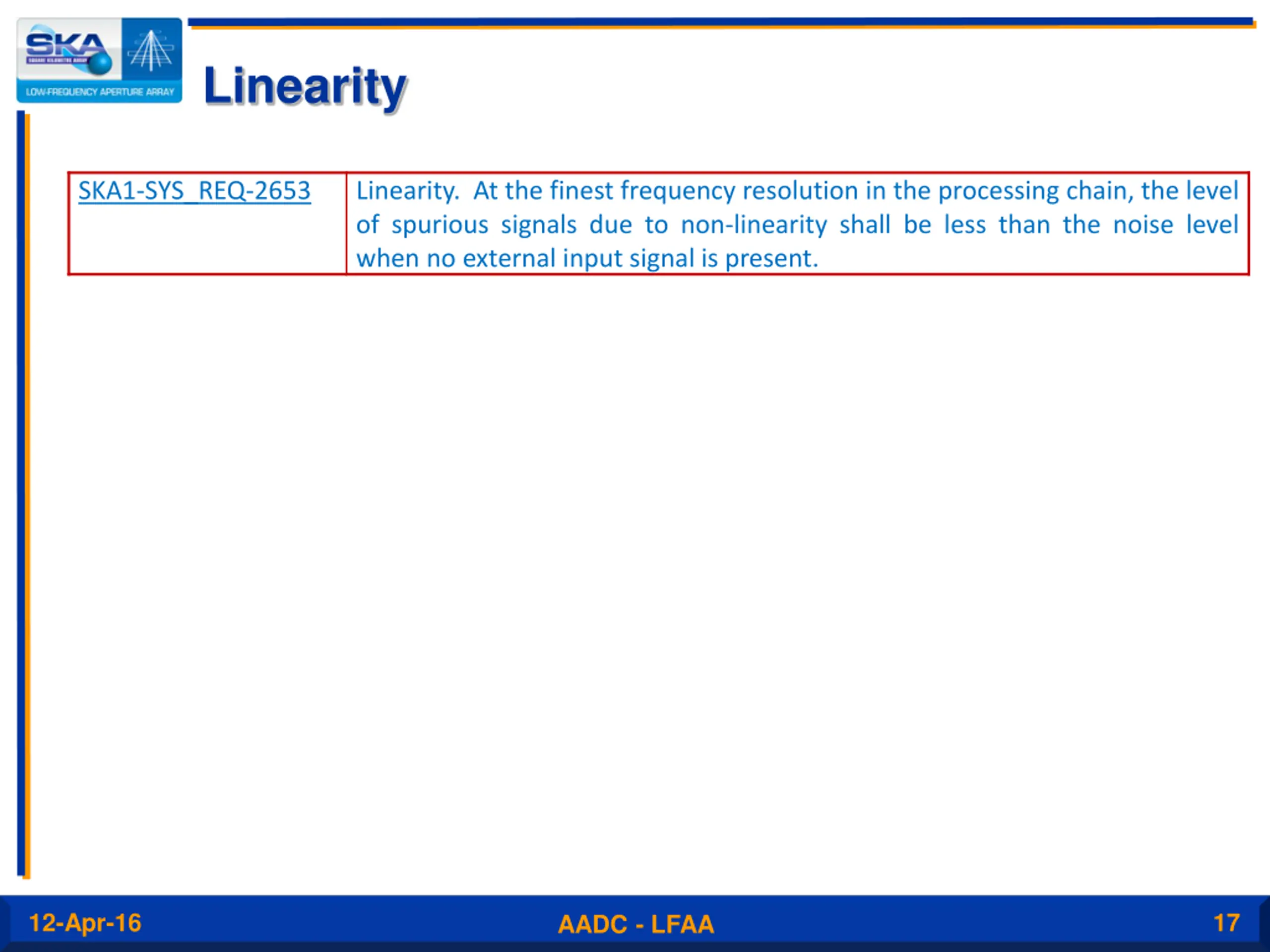 Linearity SKA1-SYS_REQ-2653 Linearity. At the finest frequency resolution in the processing chain, the level of spurious signals due to non-linearity shall be less than the noise level when no external input signal is present. 12-Apr-16 17 AADC - LFAA