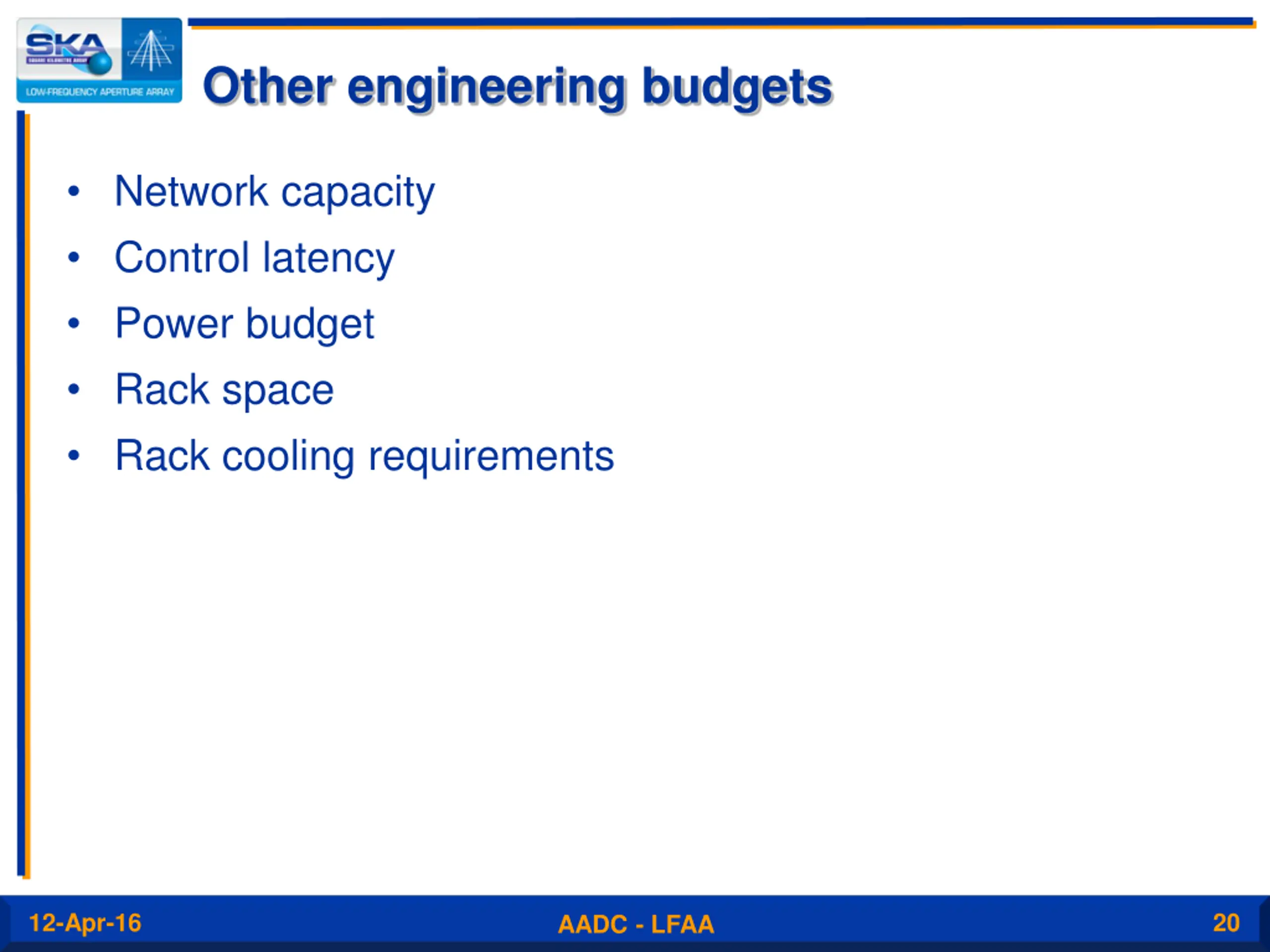 Other engineering budgets Network capacity Control latency Power budget Rack space Rack cooling requirements 12-Apr-16 20 AADC - LFAA