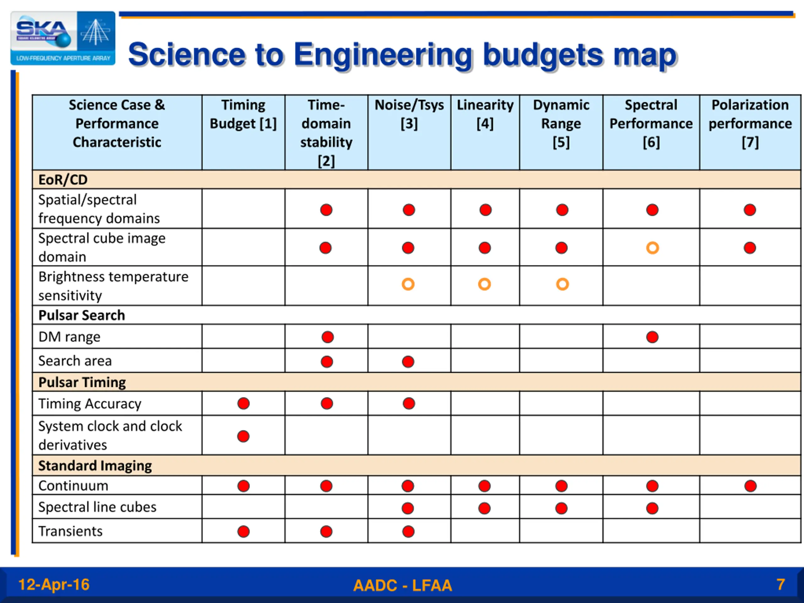 Science to Engineering budgets map Science Case & Performance Characteristic Timing Budget [1] Time- domain stability [2] Noise/Tsys [3] Linearity [4] Dynamic Range [5] Spectral Performance [6] Polarization performance [7] EoR/CD Spatial/spectral frequency domains Spectral cube image domain Brightness temperature sensitivity Pulsar Search DM range x x x x x x x x x x x x x Search area Pulsar Timing Timing Accuracy System clock and clock derivatives Standard Imaging Continuum Spectral line cubes x x x x x x x x x x x x x x x x x Transients x x x 12-Apr-16 7 AADC - LFAA