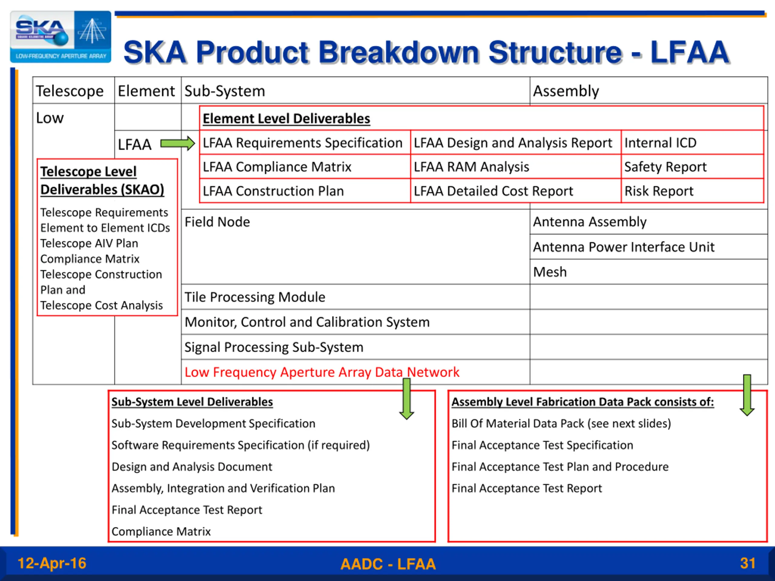SKA Product Breakdown Structure - LFAA Telescope Element Sub-System Assembly Low Element Level Deliverables LFAA Requirements Specification LFAA Design and Analysis Report Internal ICD LFAA LFAA Compliance Matrix LFAA RAM Analysis Safety Report Telescope Level Deliverables (SKAO) LFAA Construction Plan LFAA Detailed Cost Report Risk Report Telescope Requirements Element to Element ICDs Telescope AIV Plan Compliance Matrix Telescope Construction Plan and Telescope Cost Analysis Antenna Assembly Field Node Antenna Power Interface Unit Mesh Tile Processing Module Monitor, Control and Calibration System Signal Processing Sub-System Low Frequency Aperture Array Data Network Sub-System Level Deliverables Assembly Level Fabrication Data Pack consists of: Sub-System Development Specification Bill Of Material Data Pack (see next slides) Software Requirements Specification (if required) Final Acceptance Test Specification Design and Analysis Document Final Acceptance Test Plan and Procedure Assembly, Integration and Verification Plan Final Acceptance Test Report Final Acceptance Test Report Compliance Matrix 12-Apr-16 31 AADC - LFAA