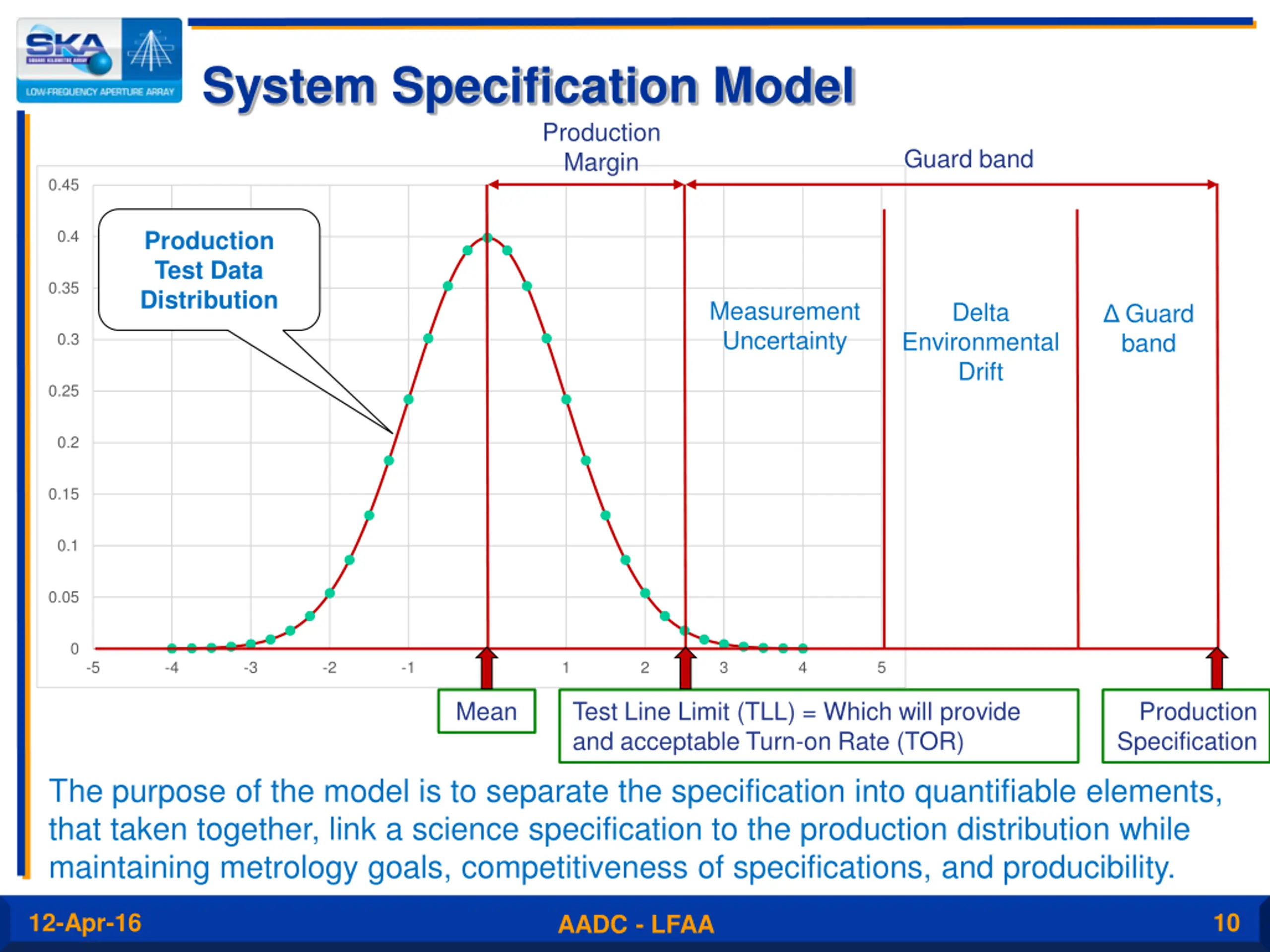 System Specification Model Production Margin Guard band 0.45 Production Test Data Distribution 0.4 0.35 Measurement Uncertainty Delta Guard band Environmental Drift 0.3 0.25 0.2 0.15 0.1 0.05 0 -5 -4 -3 -2 -1 0 1 2 3 4 5 Mean Test Line Limit (TLL) = Which will provide and acceptable Turn-on Rate (TOR) Production Specification The purpose of the model is to separate the specification into quantifiable elements, that taken together, link a science specification to the production distribution while maintaining metrology goals, competitiveness of specifications, and producibility. 12-Apr-16 10 AADC - LFAA