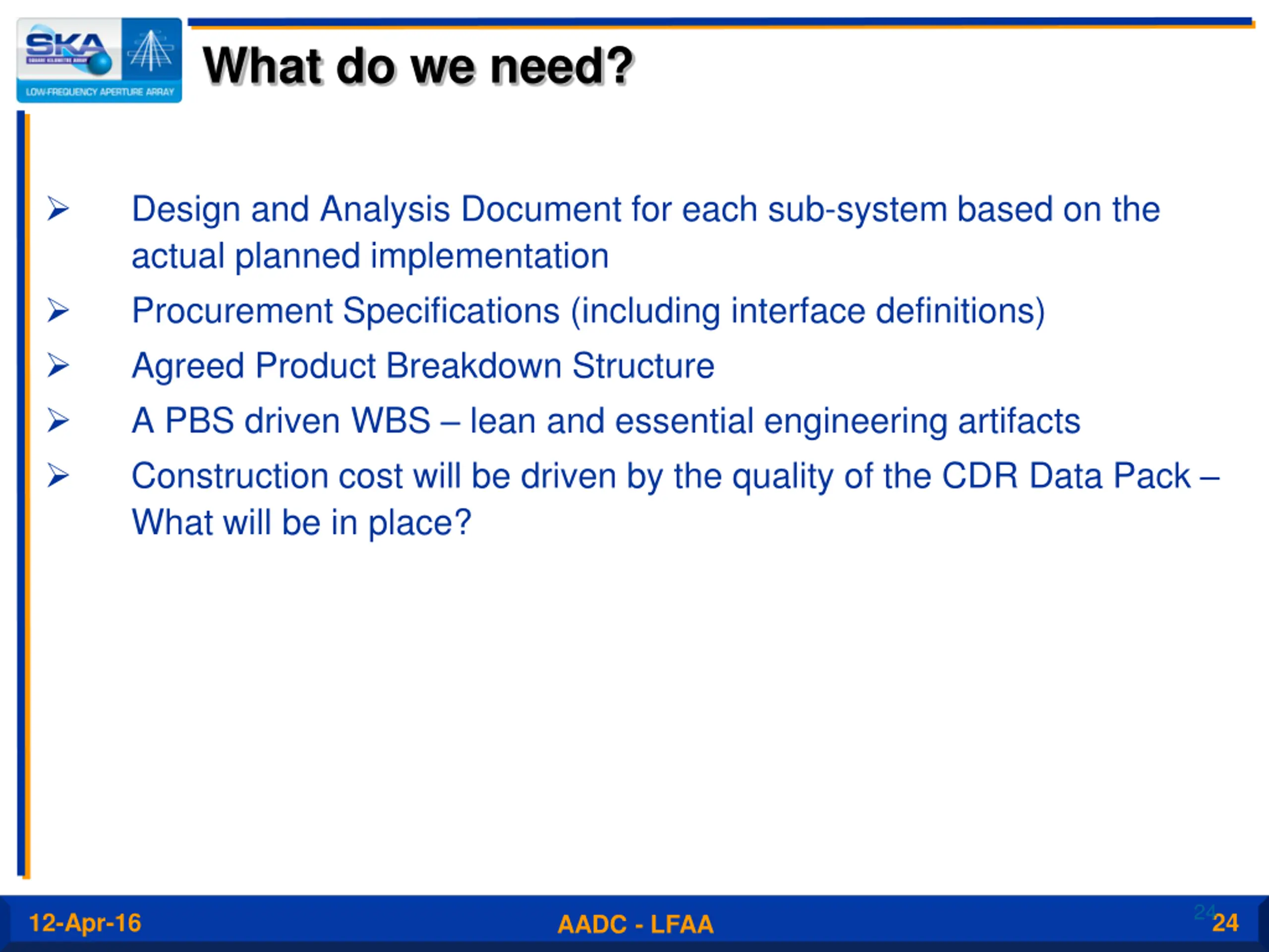 What do we need? Design and Analysis Document for each sub-system based on the actual planned implementation Procurement Specifications (including interface definitions) Agreed Product Breakdown Structure A PBS driven WBS lean and essential engineering artifacts Construction cost will be driven by the quality of the CDR Data Pack What will be in place? 24 12-Apr-16 24 AADC - LFAA