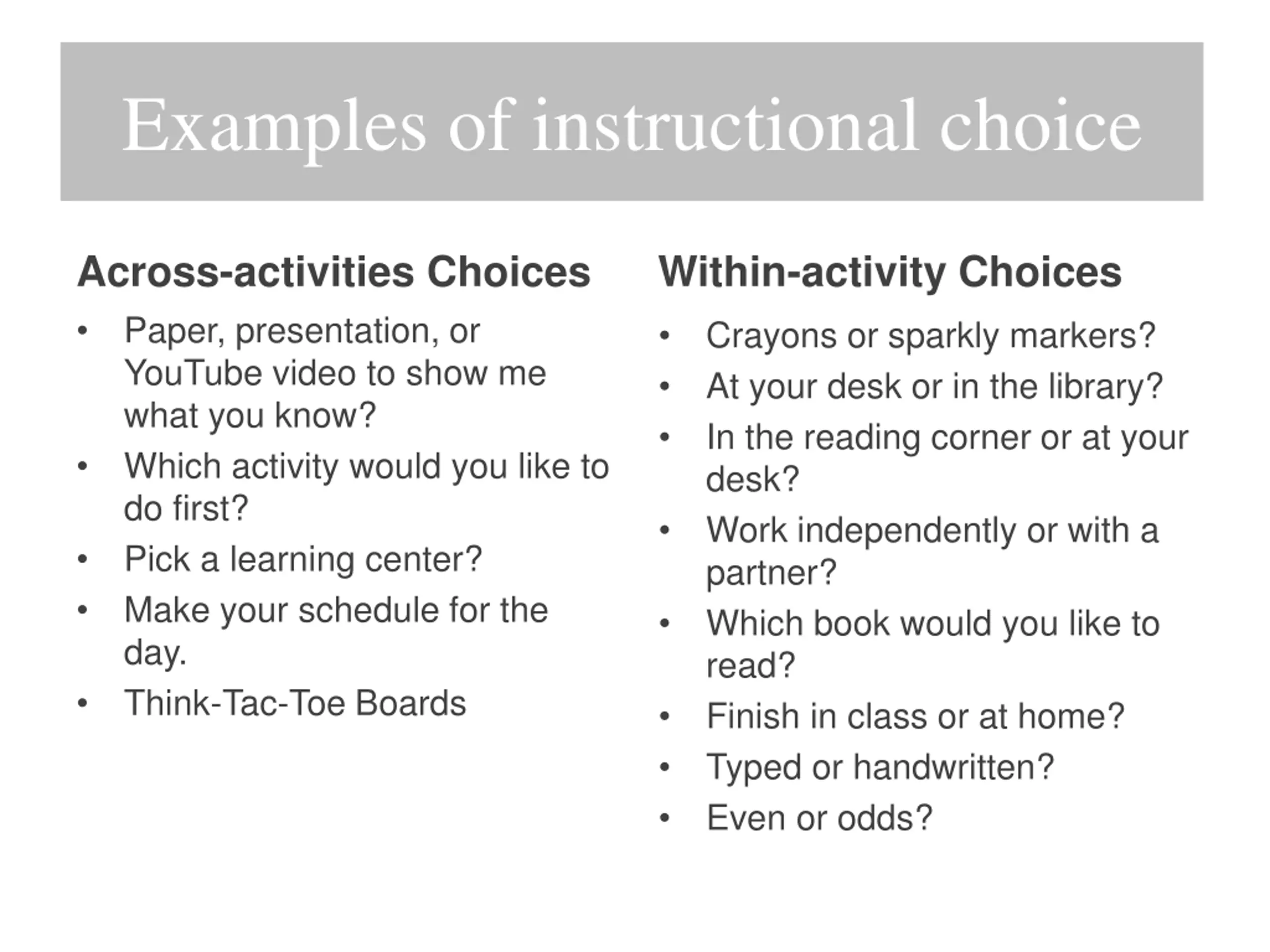 Examples of instructional choice Across-activities Choices Paper, presentation, or YouTube video to show me what you know? Which activity would you like to do first? Pick a learning center? Make your schedule for the day. Think-Tac-Toe Boards Within-activity Choices Crayons or sparkly markers? At your desk or in the library? In the reading corner or at your desk? Work independently or with a partner? Which book would you like to read? Finish in class or at home? Typed or handwritten? Even or odds?