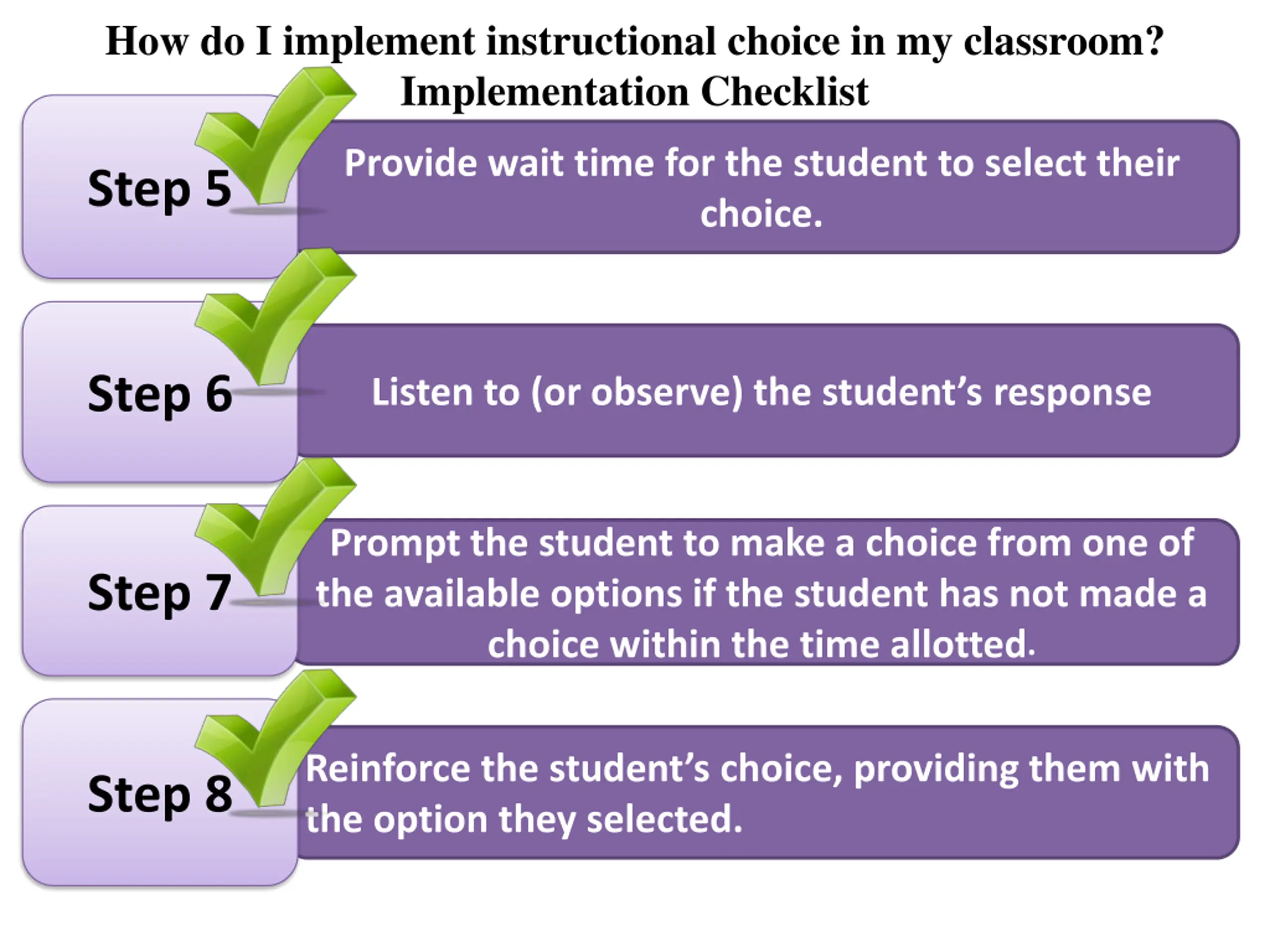How do I implement instructional choice in my classroom? Implementation Checklist Provide wait time for the student to select their choice. Step 5 Step 6 Listen to (or observe) the student s response Prompt the student to make a choice from one of the available options if the student has not made a choice within the time allotted. Step 7 Reinforce the student s choice, providing them with the option they selected. Step 8