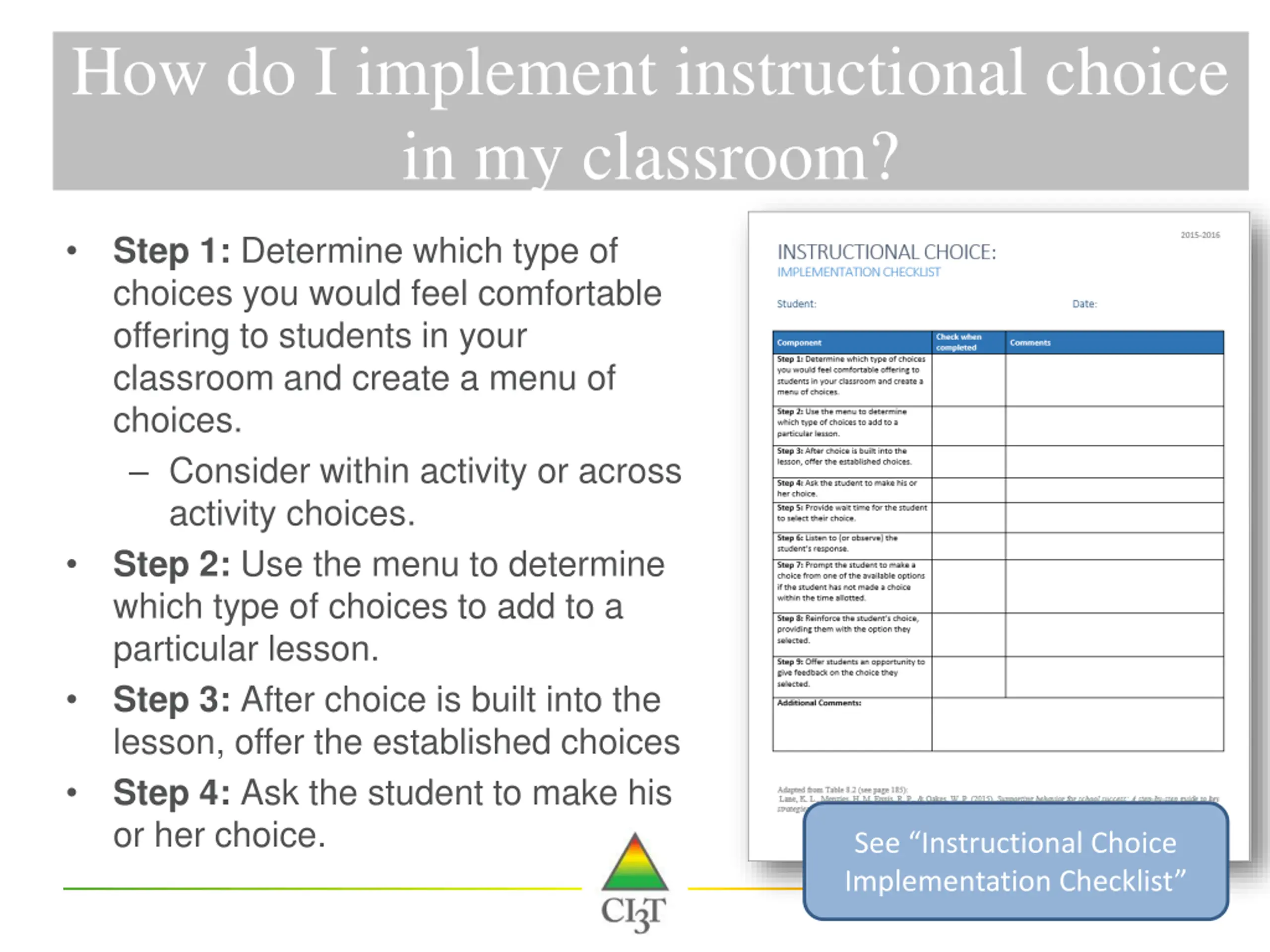 How do I implement instructional choice in my classroom? Step 1: Determine which type of choices you would feel comfortable offering to students in your classroom and create a menu of choices. Consider within activity or across activity choices. Step 2: Use the menu to determine which type of choices to add to a particular lesson. Step 3: After choice is built into the lesson, offer the established choices Step 4: Ask the student to make his or her choice. See Instructional Choice Implementation Checklist