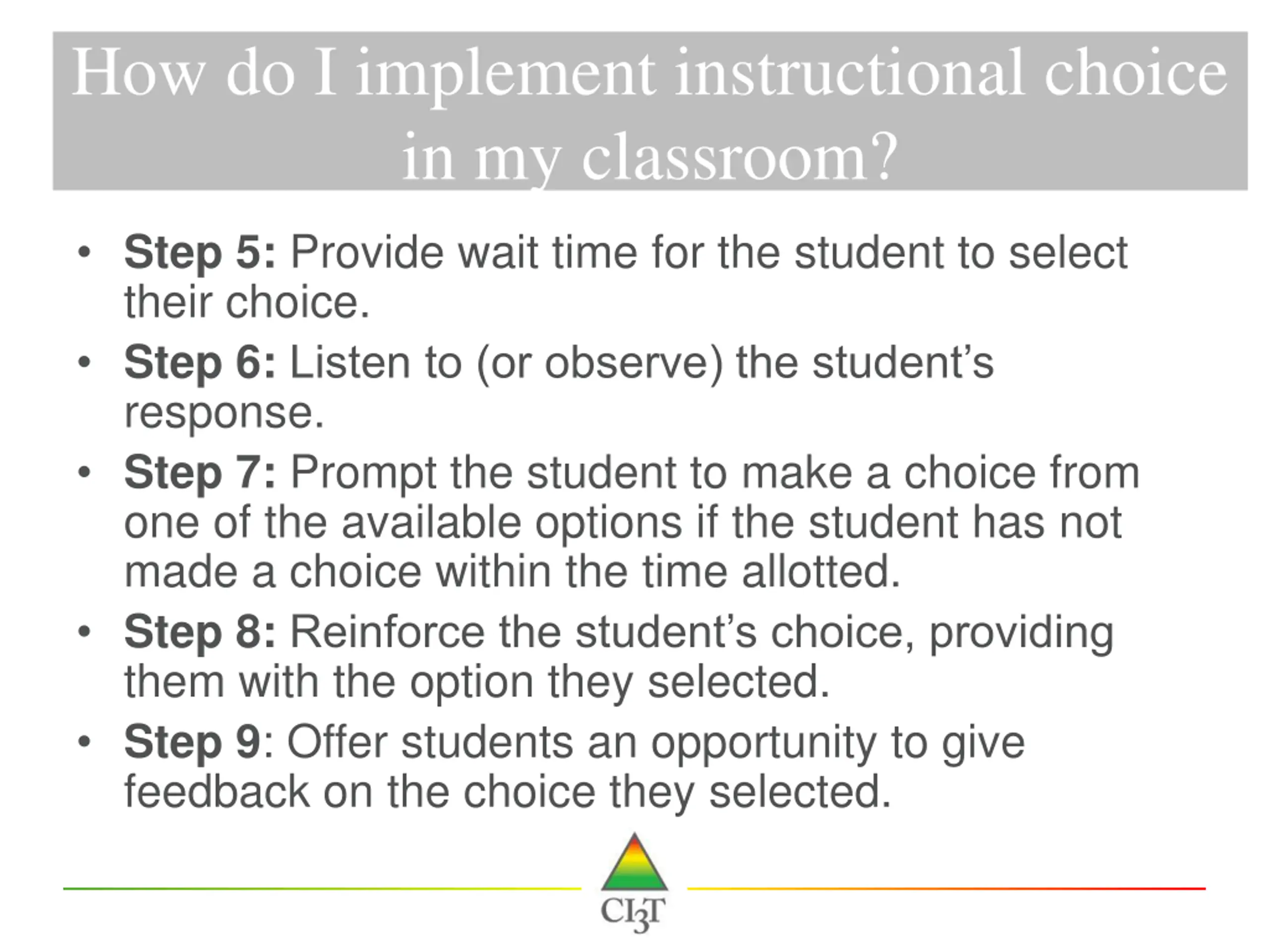 How do I implement instructional choice in my classroom? Step 5: Provide wait time for the student to select their choice. Step 6: Listen to (or observe) the student s response. Step 7: Prompt the student to make a choice from one of the available options if the student has not made a choice within the time allotted. Step 8: Reinforce the student s choice, providing them with the option they selected. Step 9: Offer students an opportunity to give feedback on the choice they selected.