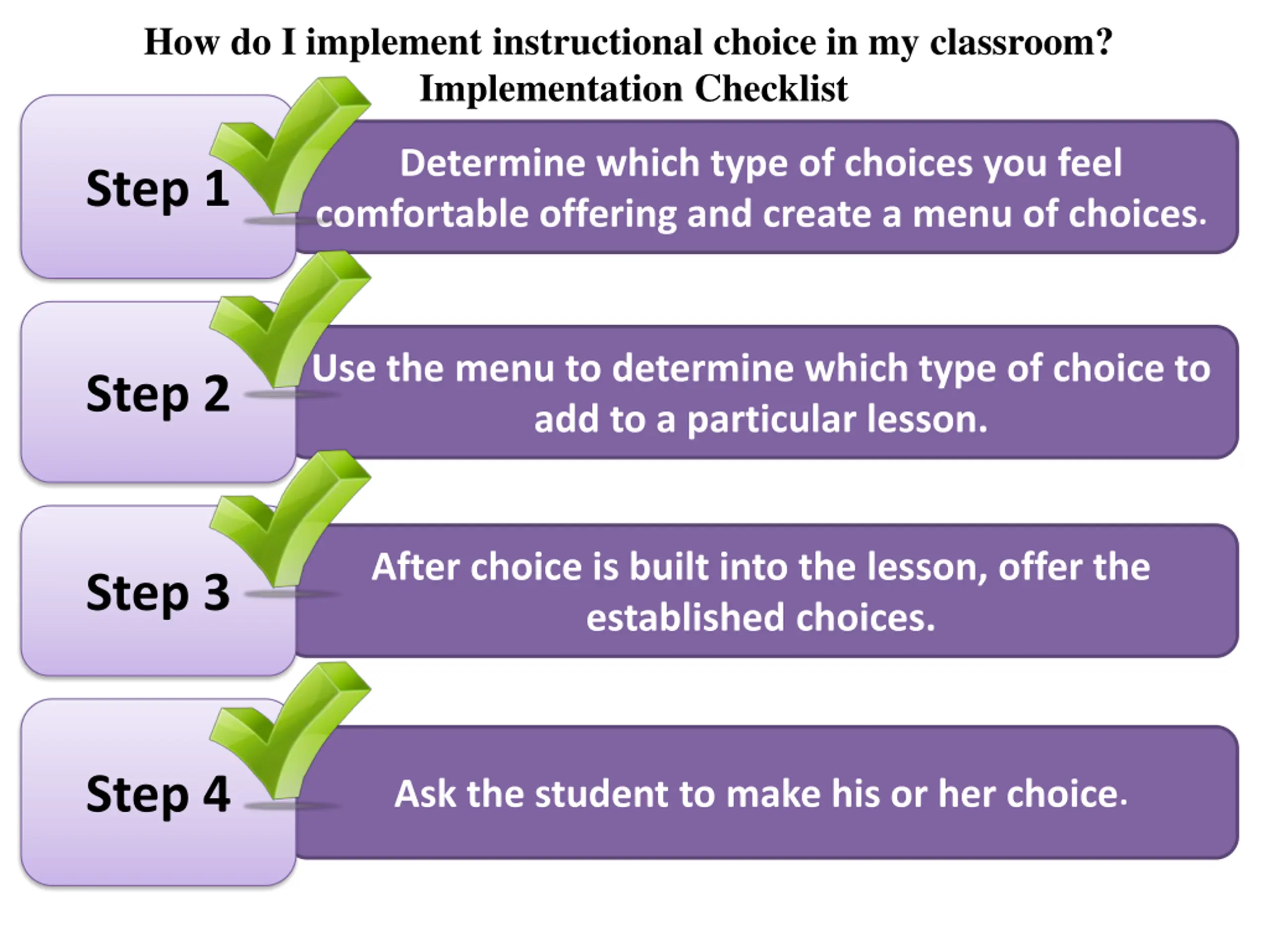 How do I implement instructional choice in my classroom? Implementation Checklist ! Determine which type of choices you feel comfortable offering and create a menu of choices. Step 1 Use the menu to determine which type of choice to add to a particular lesson. Step 2 After choice is built into the lesson, offer the established choices. Step 3 Step 4 Ask the student to make his or her choice.