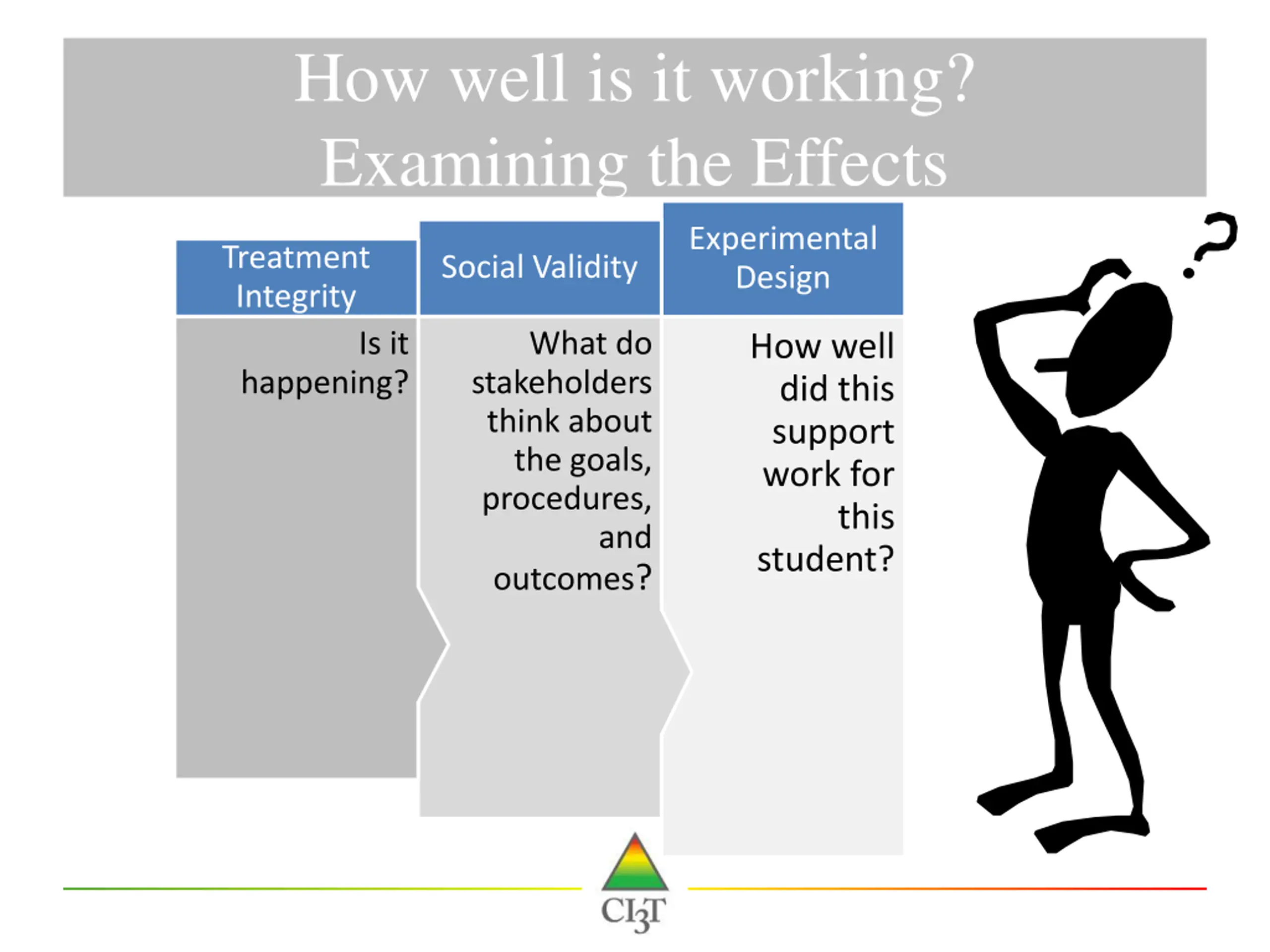 How well is it working? Examining the Effects Experimental Design Treatment Integrity Social Validity Is it What do stakeholders think about the goals, procedures, How well did this support work for happening? this and student? outcomes?