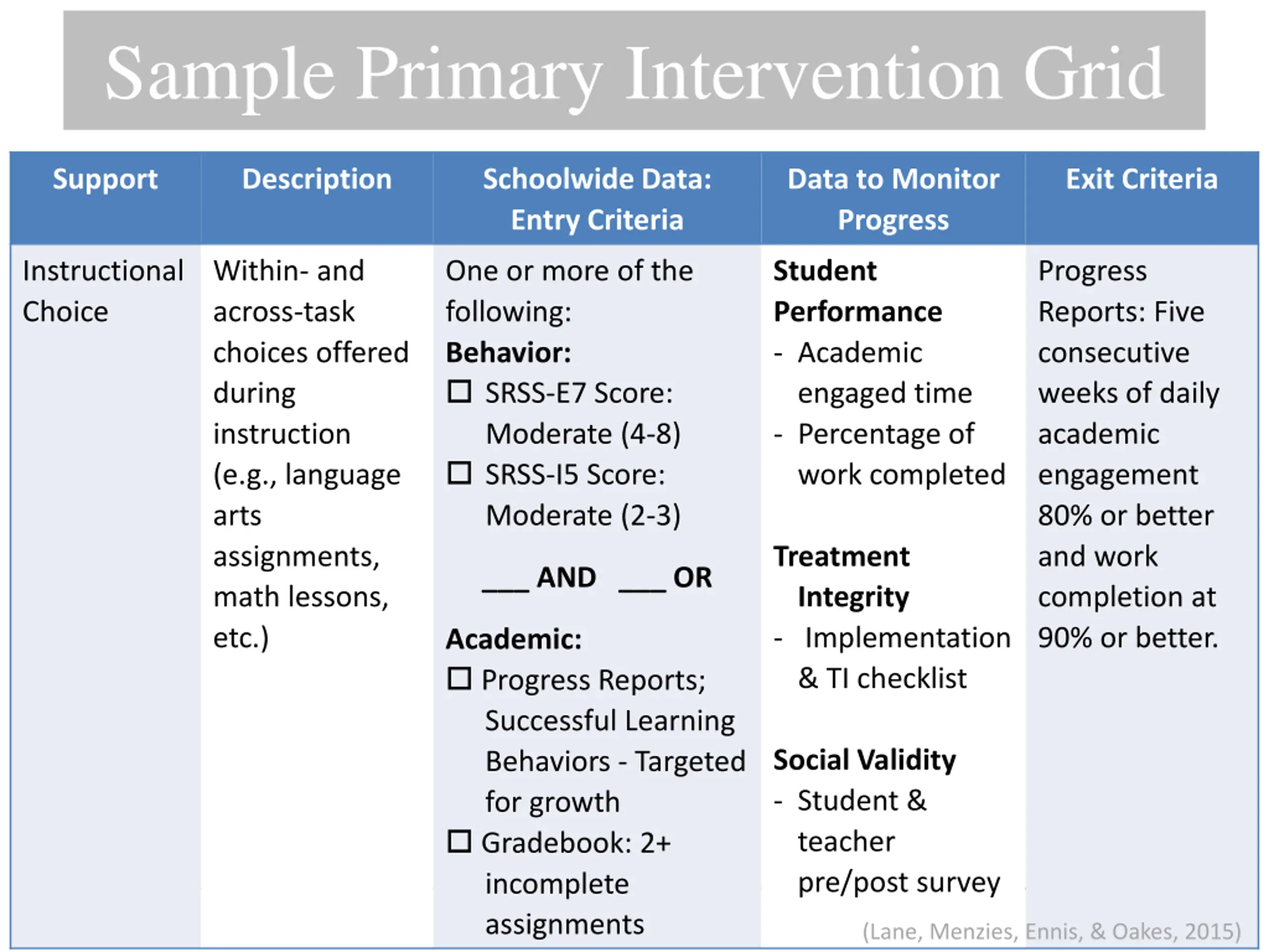 Sample Primary Intervention Grid Support Description Schoolwide Data: Entry Criteria Data to Monitor Progress Exit Criteria Instructional Choice Within- and across-task choices offered during instruction (e.g., language arts assignments, math lessons, etc.) One or more of the following: Behavior: SRSS-E7 Score: Moderate (4-8) SRSS-I5 Score: Moderate (2-3) Student Performance - Academic engaged time - Percentage of work completed Progress Reports: Five consecutive weeks of daily academic engagement 80% or better and work completion at 90% or better. Treatment Integrity - Implementation & TI checklist ___ AND ___ OR Academic: Progress Reports; Successful Learning Behaviors - Targeted for growth Gradebook: 2+ incomplete assignments Social Validity - Student & teacher pre/post survey (Lane, Menzies, Ennis, & Oakes, 2015)