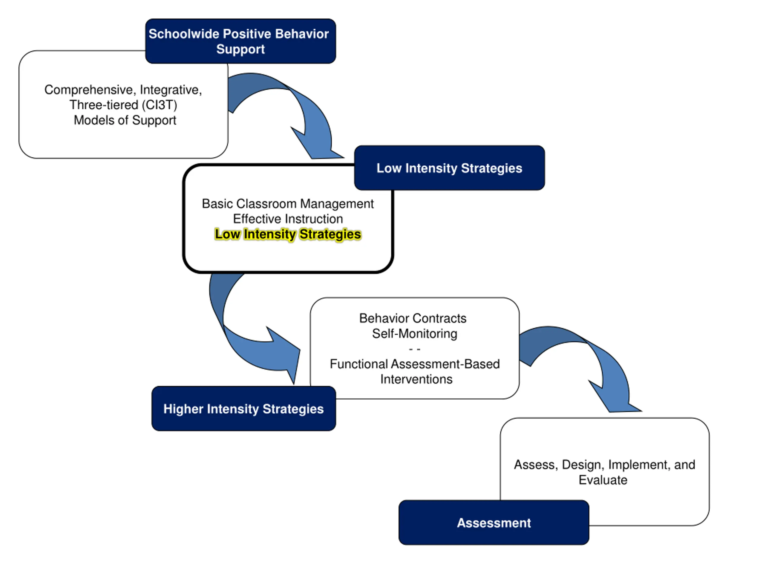 Schoolwide Positive Behavior Support Comprehensive, Integrative, Three-tiered (CI3T) Models of Support Low Intensity Strategies Basic Classroom Management Effective Instruction Low Intensity Strategies Behavior Contracts Self-Monitoring - - Functional Assessment-Based Interventions Higher Intensity Strategies Assess, Design, Implement, and Evaluate Assessment