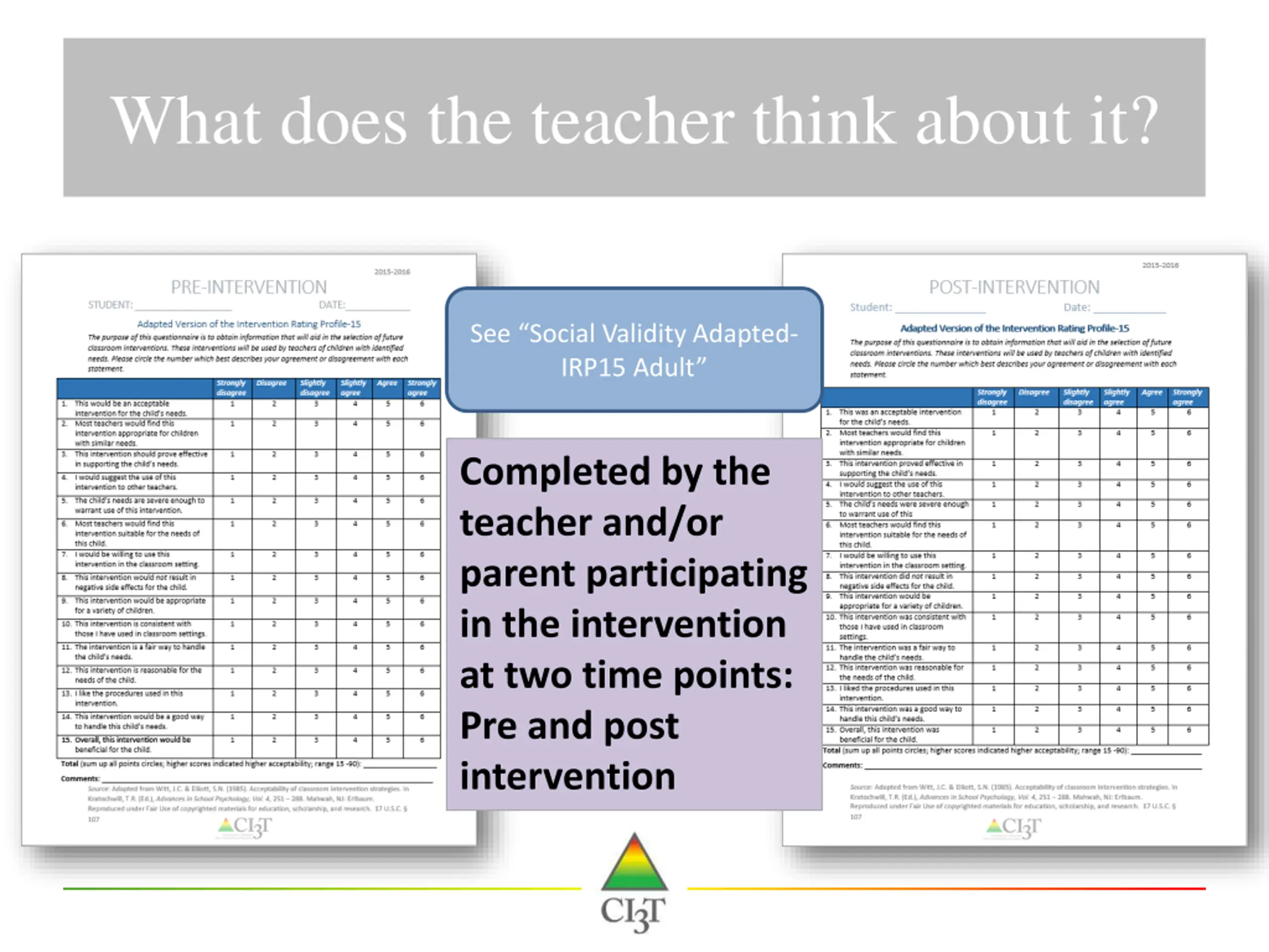 What does the teacher think about it? See Social Validity Adapted- IRP15 Adult Completed by the teacher and/or parent participating in the intervention at two time points: Pre and post intervention