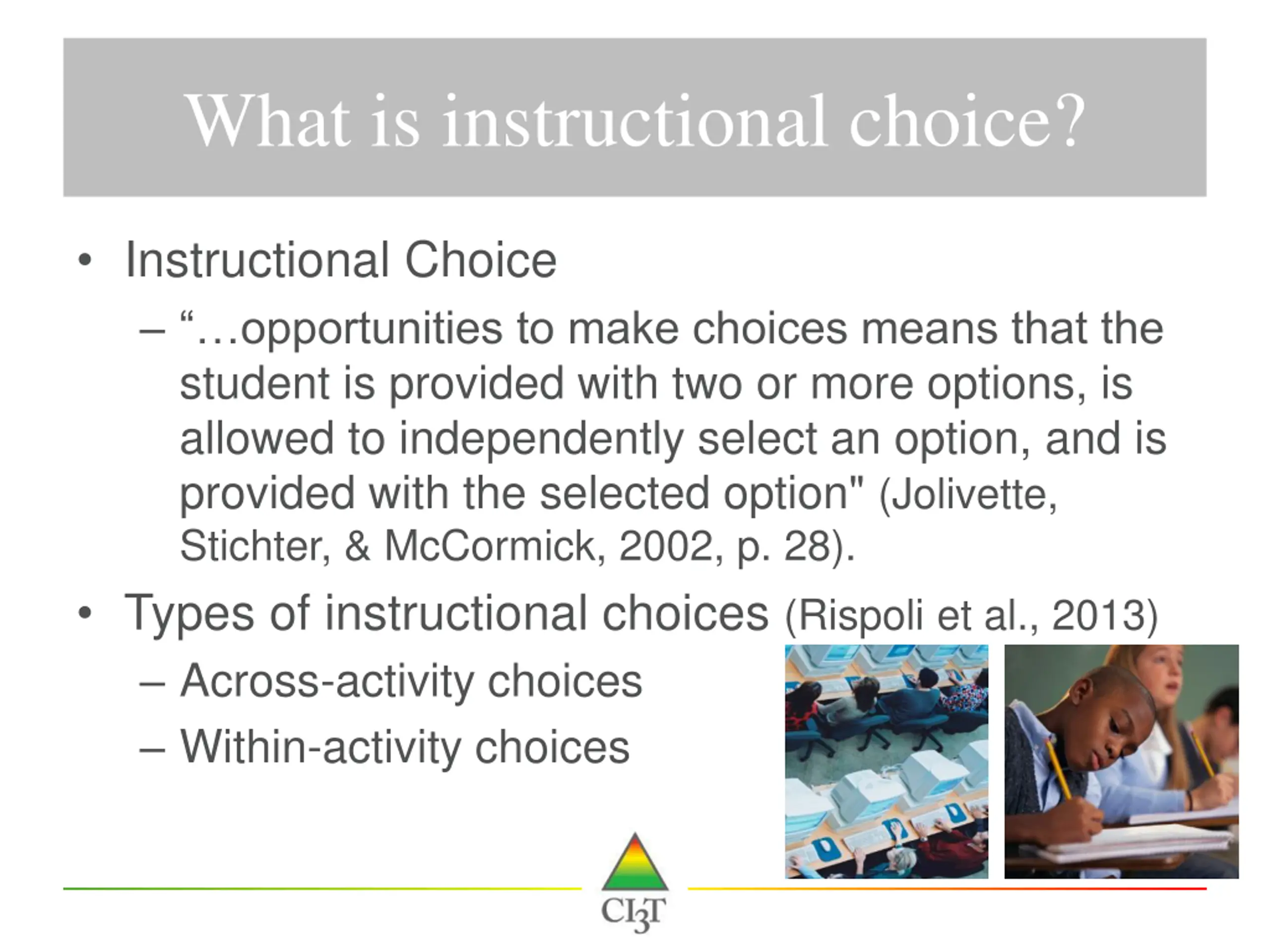 What is instructional choice? Instructional Choice opportunities to make choices means that the student is provided with two or more options, is allowed to independently select an option, and is provided with the selected option" (Jolivette, Stichter, & McCormick, 2002, p. 28). Types of instructional choices (Rispoli et al., 2013) Across-activity choices Within-activity choices