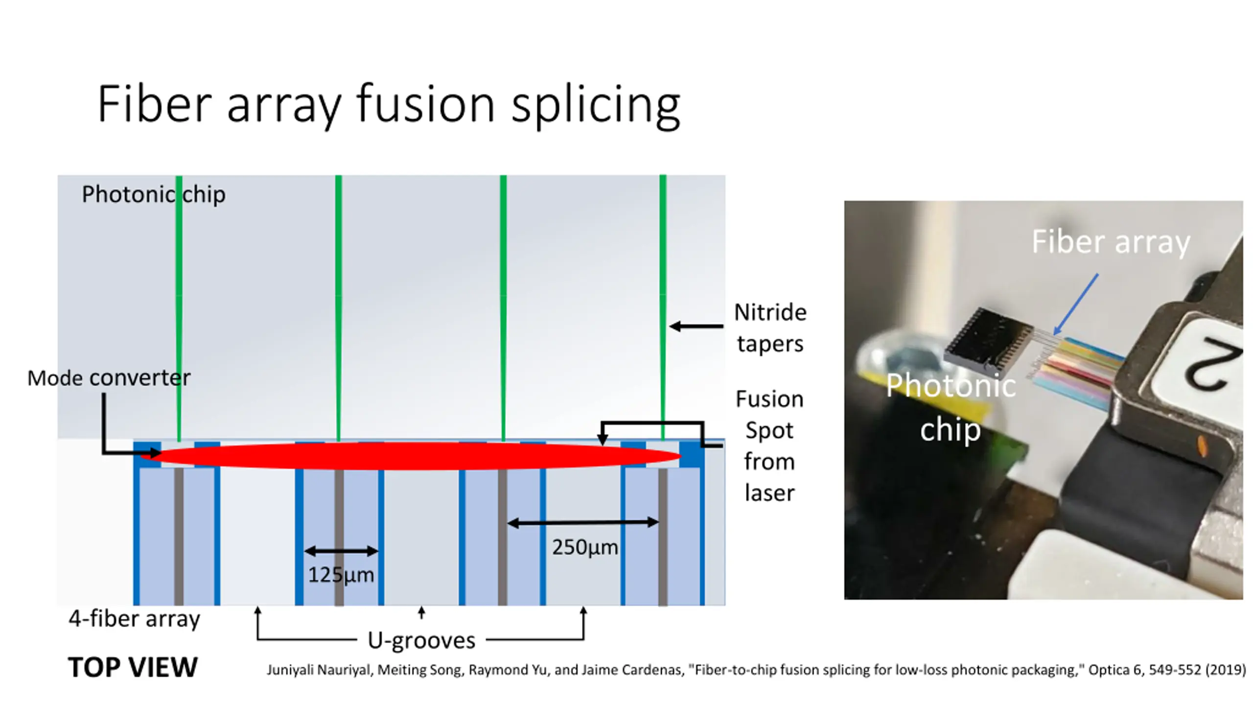 Fiber array fusion splicing Photonic chip Fiber array Nitride tapers Mode converter Photonic chip Fusion Spot from laser 250 m 125 m 4-fiber array U-grooves TOP VIEW Juniyali Nauriyal, Meiting Song, Raymond Yu, and Jaime Cardenas, "Fiber-to-chip fusion splicing for low-loss photonic packaging," Optica 6, 549-552 (2019)