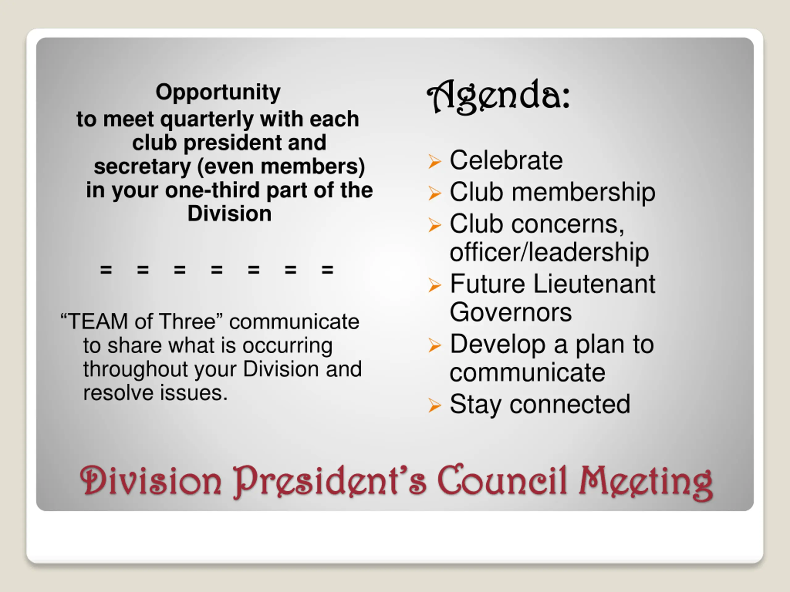 Agenda: Agenda: Opportunity to meet quarterly with each club president and secretary (even members) in your one-third part of the Division Celebrate Club membership Club concerns, officer/leadership Future Lieutenant Governors Develop a plan to communicate Stay connected = = = = = = = TEAM of Three communicate to share what is occurring throughout your Division and resolve issues. Division President s Council Meeting Division President s Council Meeting