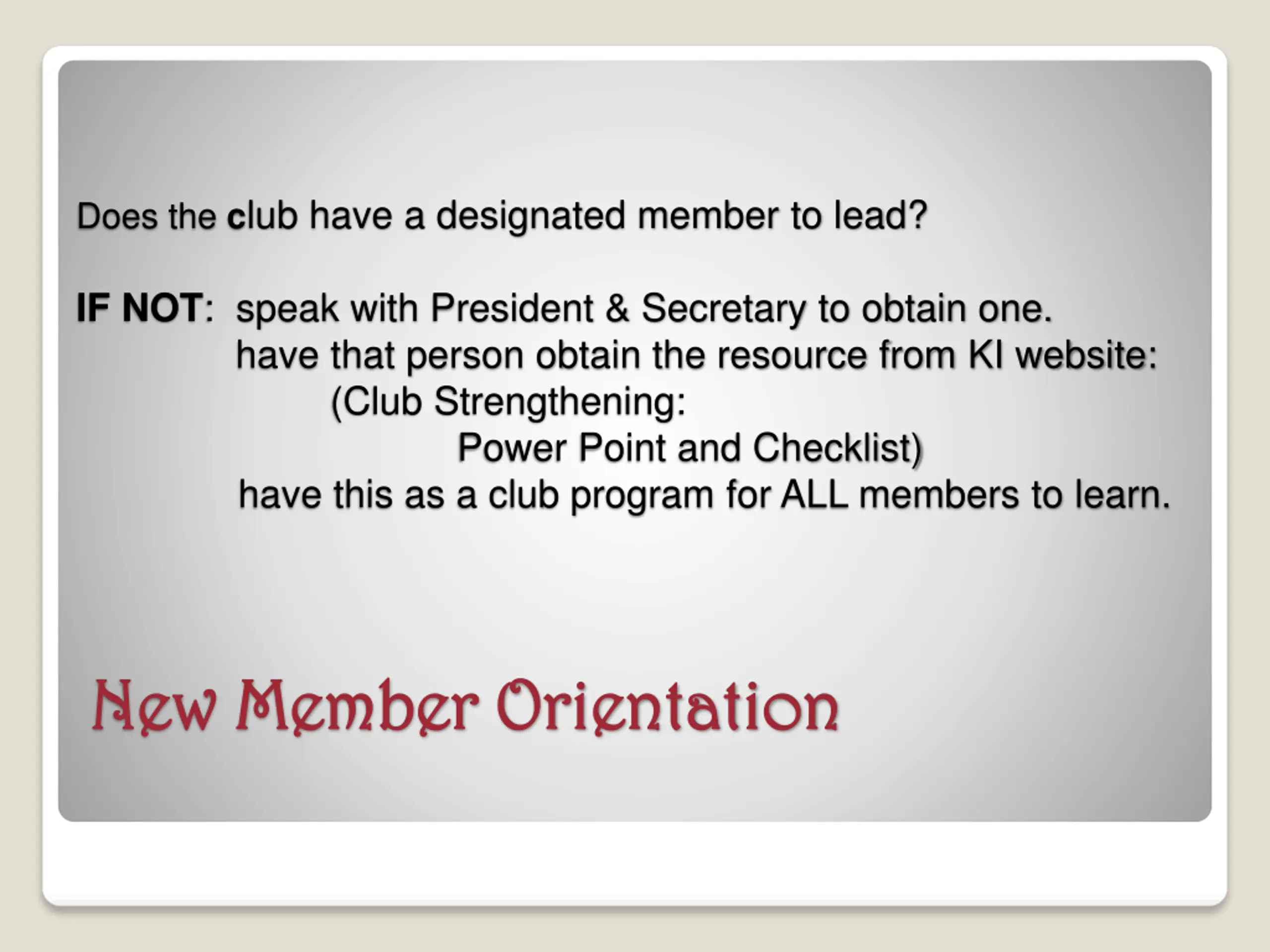 Does the club have a designated member to lead? IF NOT: speak with President & Secretary to obtain one. have that person obtain the resource from KI website: (Club Strengthening: Power Point and Checklist) have this as a club program for ALL members to learn. New Member Orientation New Member Orientation