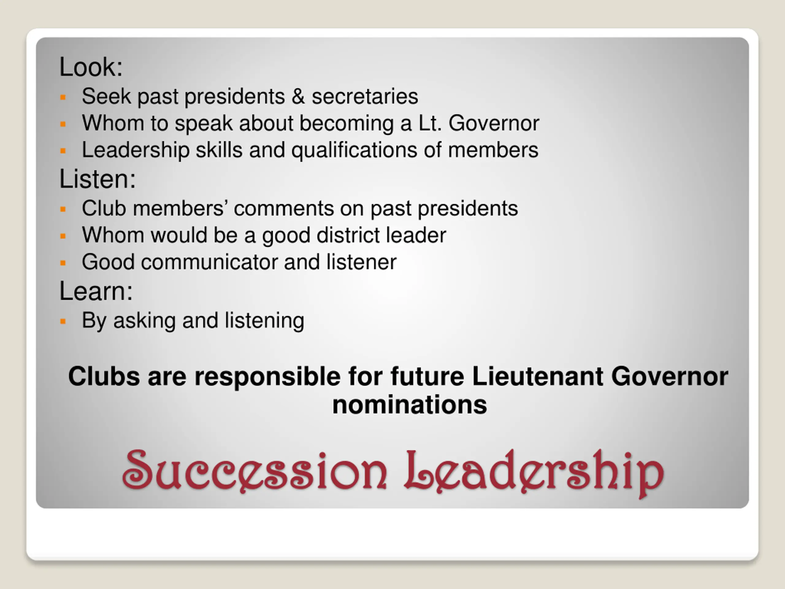 Look: Seek past presidents & secretaries Whom to speak about becoming a Lt. Governor Leadership skills and qualifications of members Listen: Club members comments on past presidents Whom would be a good district leader Good communicator and listener Learn: By asking and listening Clubs are responsible for future Lieutenant Governor nominations Succession Leadership Succession Leadership