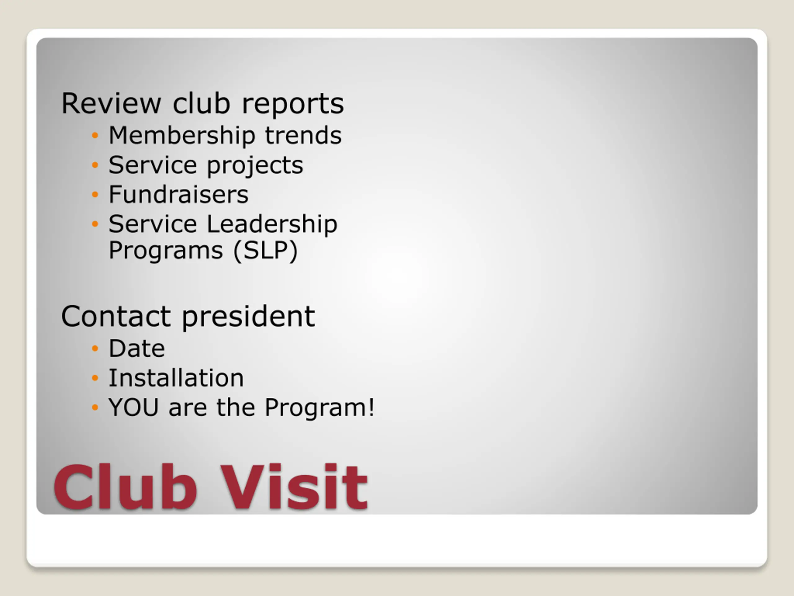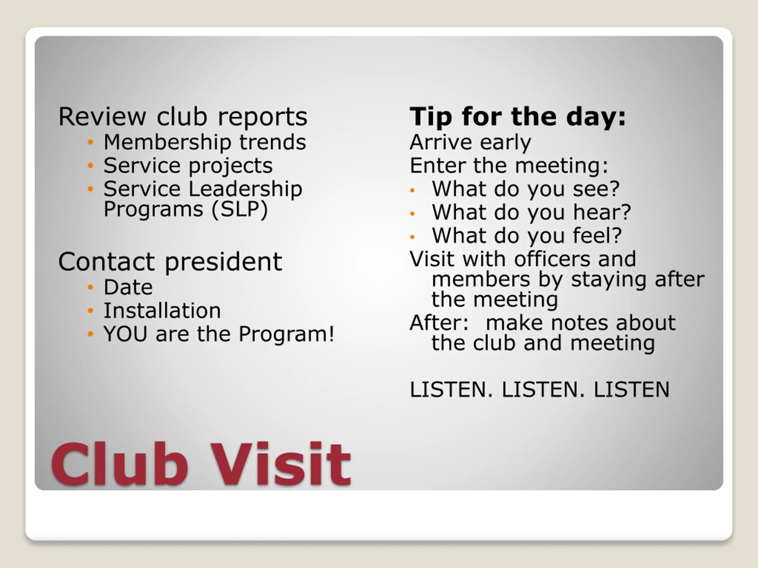 Review club reports Membership trends Service projects Service Leadership Programs (SLP) Tip for the day: Arrive early Enter the meeting: What do you see? What do you hear? What do you feel? Visit with officers and members by staying after the meeting After: make notes about the club and meeting Contact president Date Installation YOU are the Program! LISTEN. LISTEN. LISTEN Club Visit