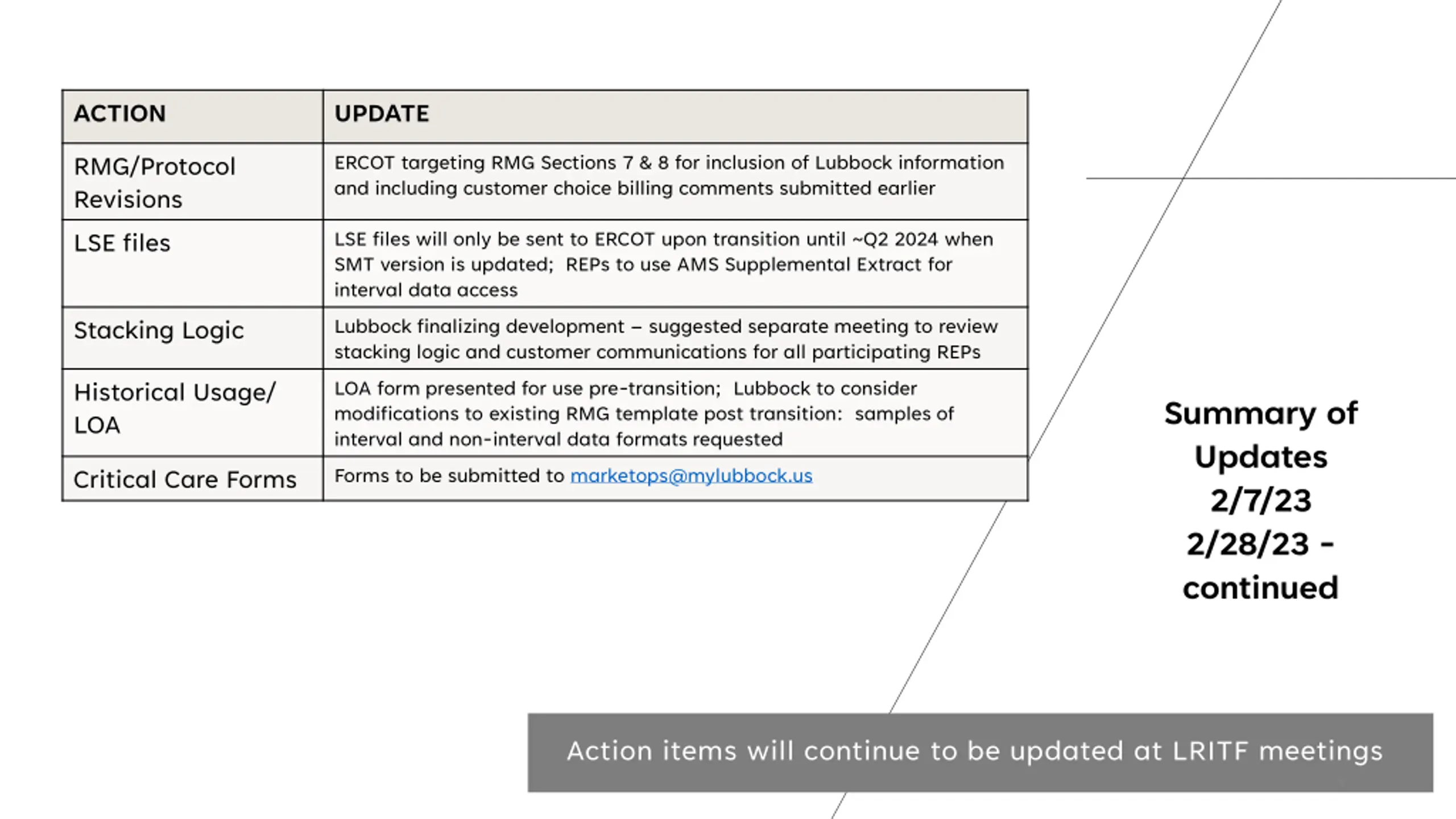 ACTION UPDATE ERCOT targeting RMG Sections 7 & 8 for inclusion of Lubbock information and including customer choice billing comments submitted earlier RMG/Protocol Revisions LSE files LSE files will only be sent to ERCOT upon transition until ~Q2 2024 when SMT version is updated; REPs to use AMS Supplemental Extract for interval data access Lubbock finalizing development suggested separate meeting to review stacking logic and customer communications for all participating REPs Stacking Logic LOA form presented for use pre-transition; Lubbock to consider modifications to existing RMG template post transition: samples of interval and non-interval data formats requested Historical Usage/ LOA Summary of Updates 2/7/23 2/28/23 - continued Forms to be submitted to marketops@mylubbock.us Critical Care Forms Action items will continue to be updated at LRITF meetings 5
