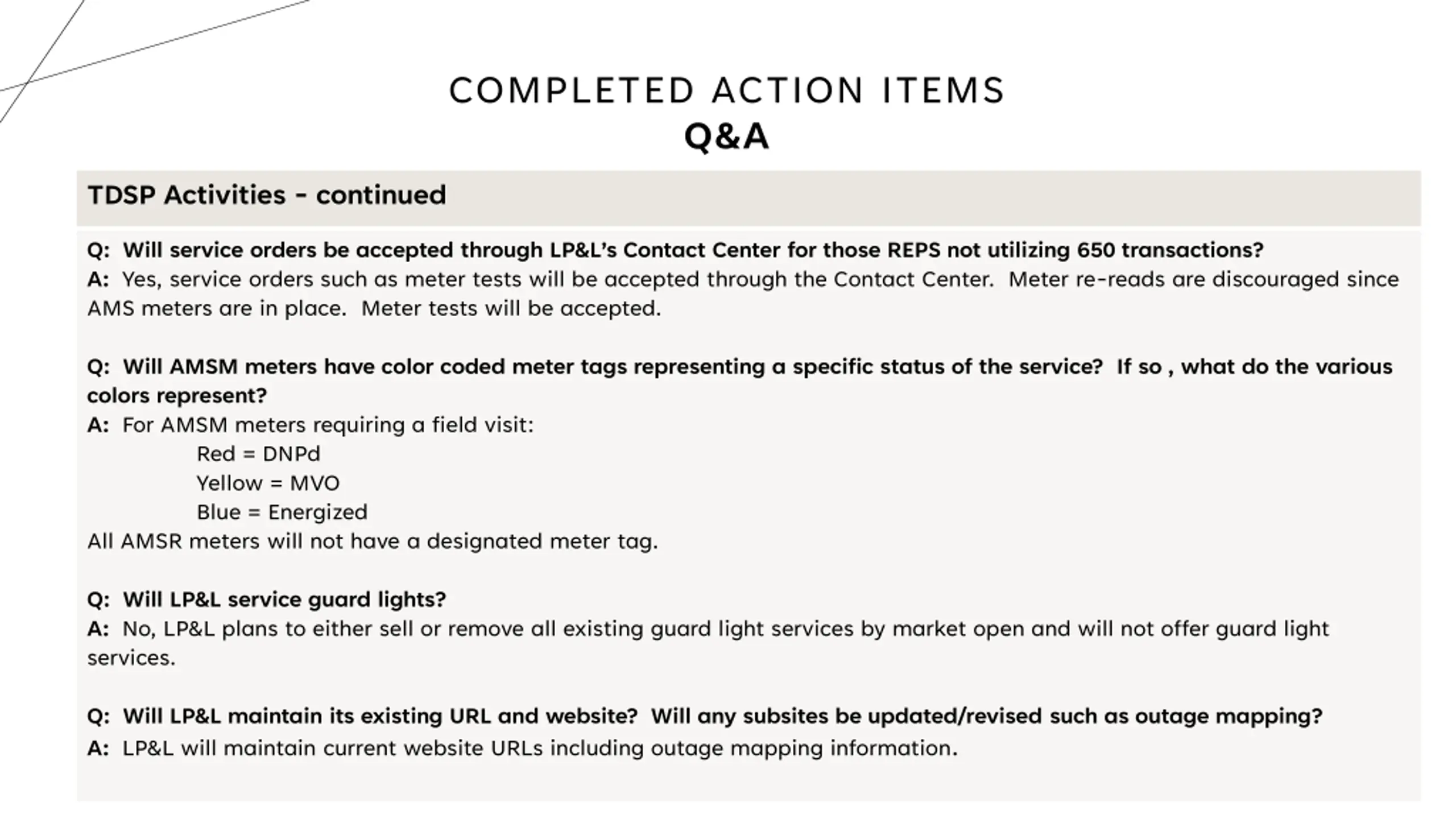 COMPLETED ACTION ITEMS Q&A TDSP Activities - continued Q: Will service orders be accepted through LP&L s Contact Center for those REPS not utilizing 650 transactions? A: Yes, service orders such as meter tests will be accepted through the Contact Center. Meter re-reads are discouraged since AMS meters are in place. Meter tests will be accepted. Q: Will AMSM meters have color coded meter tags representing a specific status of the service? If so , what do the various colors represent? A: For AMSM meters requiring a field visit: Red = DNPd Yellow = MVO Blue = Energized All AMSR meters will not have a designated meter tag. Q: Will LP&L service guard lights? A: No, LP&L plans to either sell or remove all existing guard light services by market open and will not offer guard light services. Q: Will LP&L maintain its existing URL and website? Will any subsites be updated/revised such as outage mapping? A: LP&L will maintain current website URLs including outage mapping information.