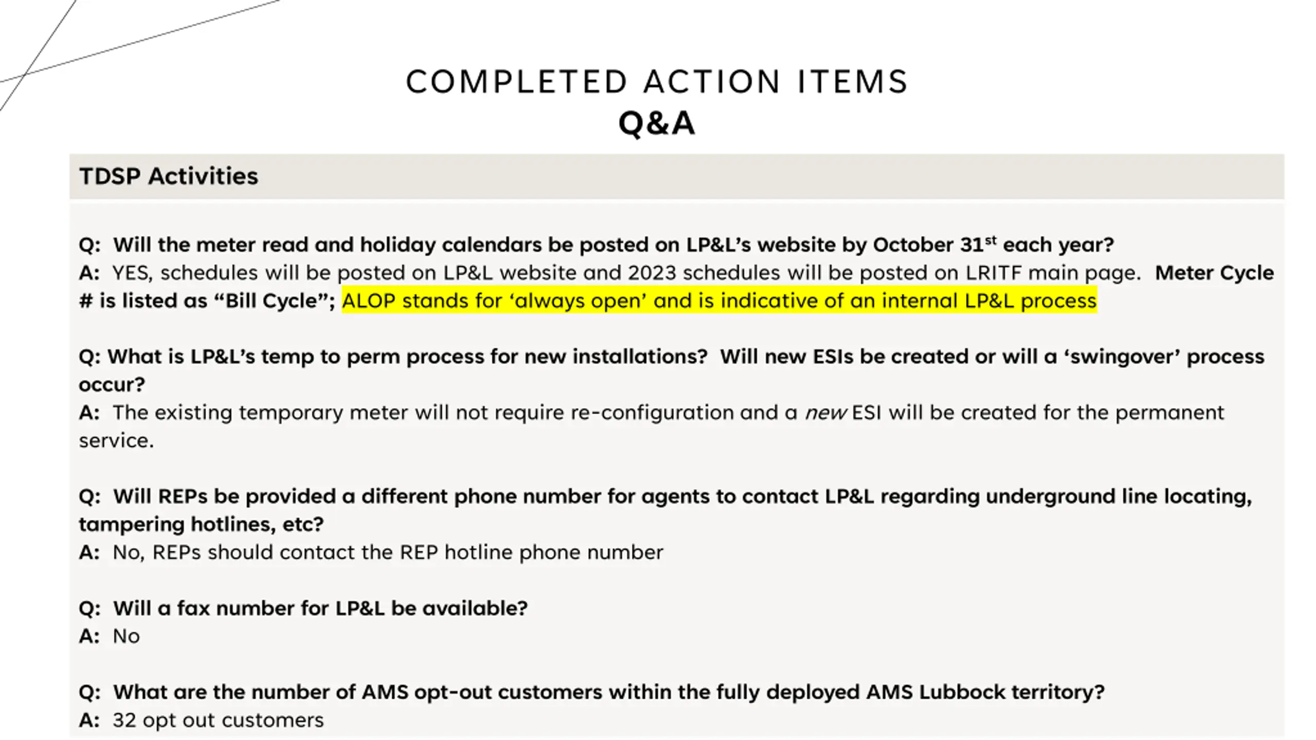 COMPLETED ACTION ITEMS Q&A TDSP Activities Q: Will the meter read and holiday calendars be posted on LP&L s website by October 31st each year? A: YES, schedules will be posted on LP&L website and 2023 schedules will be posted on LRITF main page. Meter Cycle # is listed as Bill Cycle ; ALOP stands for always open and is indicative of an internal LP&L process Q: What is LP&L s temp to perm process for new installations? Will new ESIs be created or will a swingover process occur? A: The existing temporary meter will not require re-configuration and a new ESI will be created for the permanent service. Q: Will REPs be provided a different phone number for agents to contact LP&L regarding underground line locating, tampering hotlines, etc? A: No, REPs should contact the REP hotline phone number Q: Will a fax number for LP&L be available? A: No Q: What are the number of AMS opt-out customers within the fully deployed AMS Lubbock territory? A: 32 opt out customers