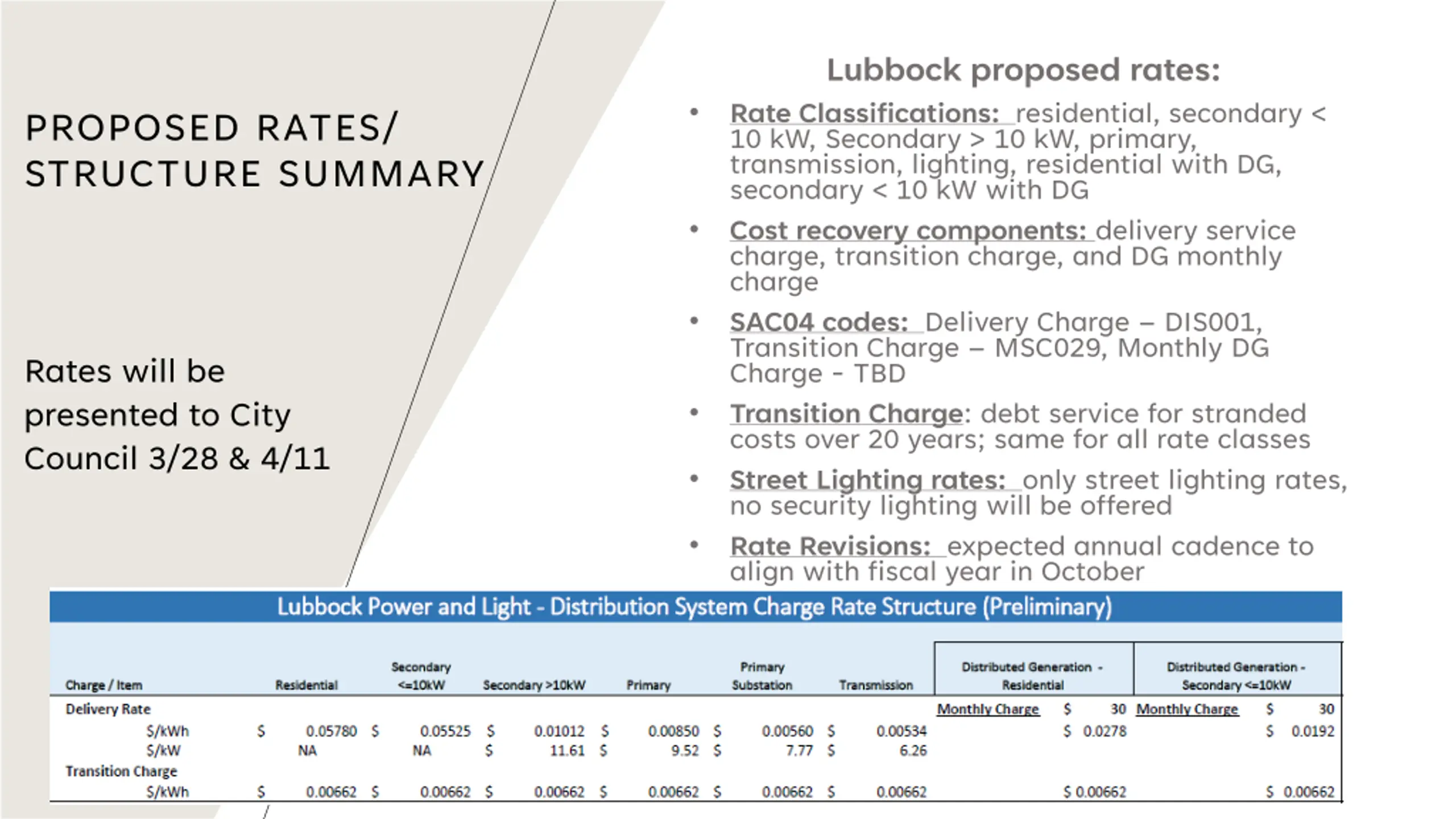 Lubbock proposed rates: Rate Classifications: residential, secondary < 10 kW, Secondary > 10 kW, primary, transmission, lighting, residential with DG, secondary < 10 kW with DG Cost recovery components: delivery service charge, transition charge, and DG monthly charge SAC04 codes: Delivery Charge DIS001, Transition Charge MSC029, Monthly DG Charge - TBD Transition Charge: debt service for stranded costs over 20 years; same for all rate classes Street Lighting rates: only street lighting rates, no security lighting will be offered Rate Revisions: expected annual cadence to align with fiscal year in October PROPOSED RATES/ STRUCTURE SUMMARY Rates will be presented to City Council 3/28 & 4/11