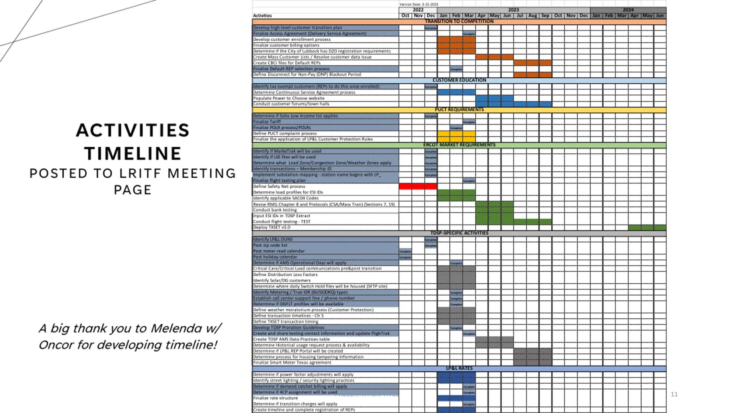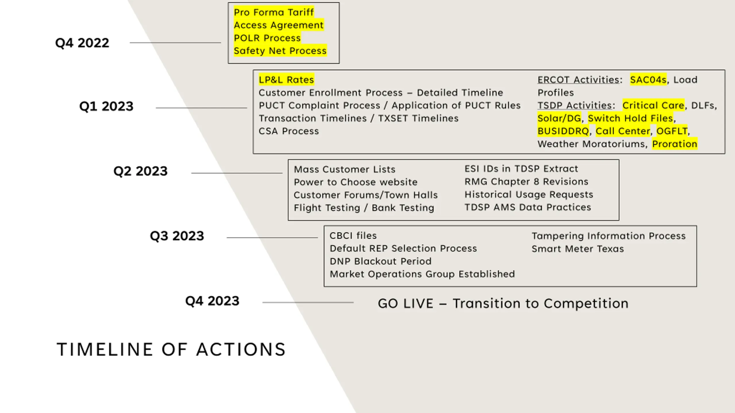 Pro Forma Tariff Access Agreement POLR Process Safety Net Process Q4 2022 LP&L Rates Customer Enrollment Process Detailed Timeline PUCT Complaint Process / Application of PUCT Rules Transaction Timelines / TXSET Timelines CSA Process ERCOT Activities: SAC04s, Load Profiles TSDP Activities: Critical Care, DLFs, Solar/DG, Switch Hold Files, BUSIDDRQ, Call Center, OGFLT, Weather Moratoriums, Proration Q1 2023 Q2 2023 ESI IDs in TDSP Extract RMG Chapter 8 Revisions Historical Usage Requests TDSP AMS Data Practices Mass Customer Lists Power to Choose website Customer Forums/Town Halls Flight Testing / Bank Testing Q3 2023 CBCI files Default REP Selection Process DNP Blackout Period Market Operations Group Established Tampering Information Process Smart Meter Texas Q4 2023 GO LIVE Transition to Competition TIMELINE OF ACTIONS