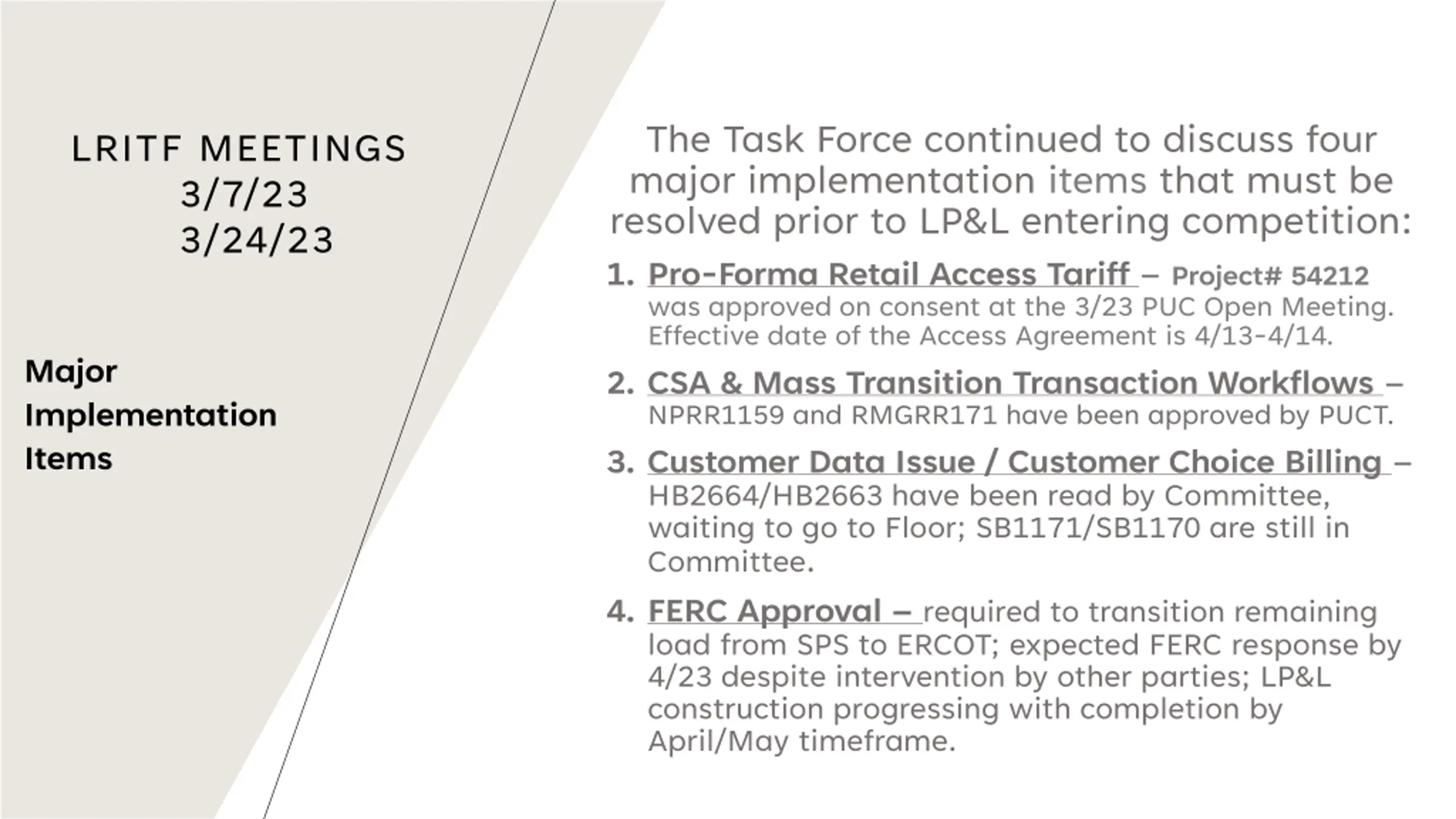The Task Force continued to discuss four major implementation items that must be resolved prior to LP&L entering competition: 1. Pro-Forma Retail Access Tariff Project# 54212 was approved on consent at the 3/23 PUC Open Meeting. Effective date of the Access Agreement is 4/13-4/14. 2. CSA & Mass Transition Transaction Workflows NPRR1159 and RMGRR171 have been approved by PUCT. 3. Customer Data Issue / Customer Choice Billing HB2664/HB2663 have been read by Committee, waiting to go to Floor; SB1171/SB1170 are still in Committee. 4. FERC Approval required to transition remaining load from SPS to ERCOT; expected FERC response by 4/23 despite intervention by other parties; LP&L construction progressing with completion by April/May timeframe. LRITF MEETINGS 3/7/23 3/24/23 Major Implementation Items