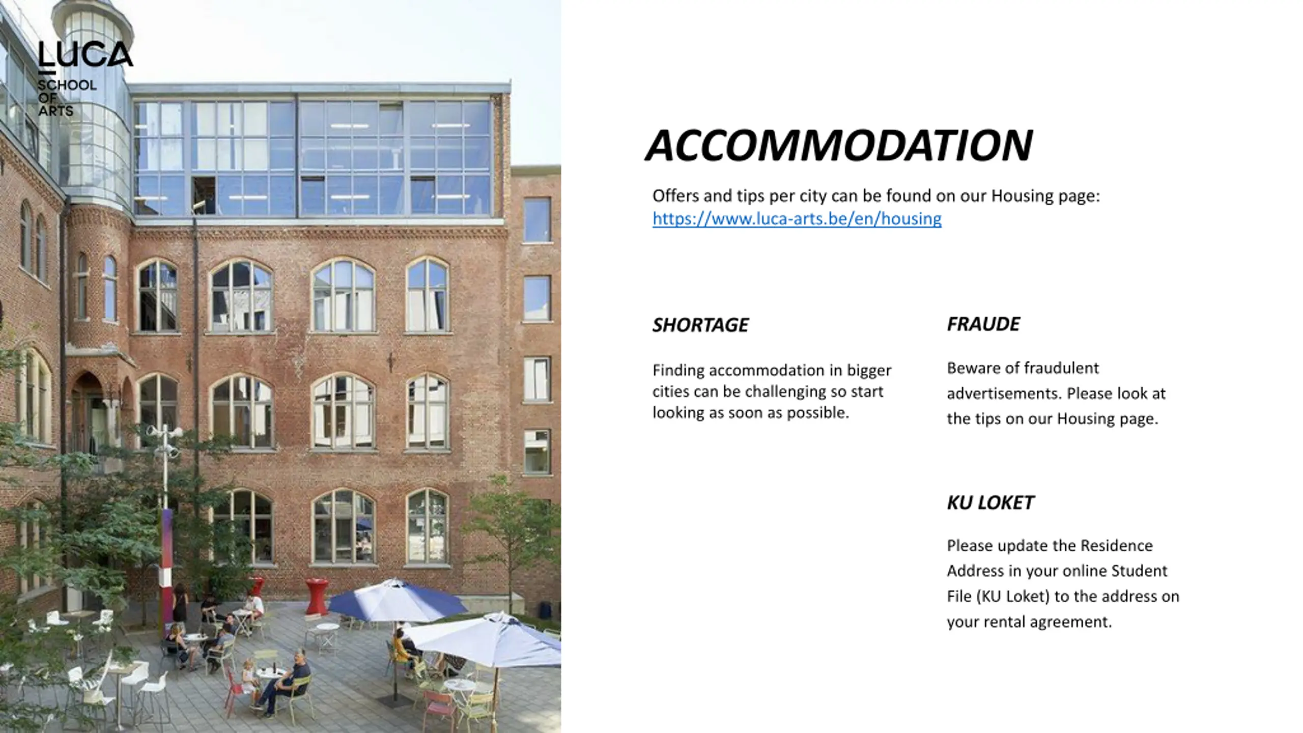 ACCOMMODATION Offers and tips per city can be found on our Housing page: https://www.luca-arts.be/en/housing FRAUDE SHORTAGE Beware of fraudulent advertisements. Please look at the tips on our Housing page. Finding accommodation in bigger cities can be challenging so start looking as soon as possible. KU LOKET Please update the Residence Address in your online Student File (KU Loket) to the address on your rental agreement.