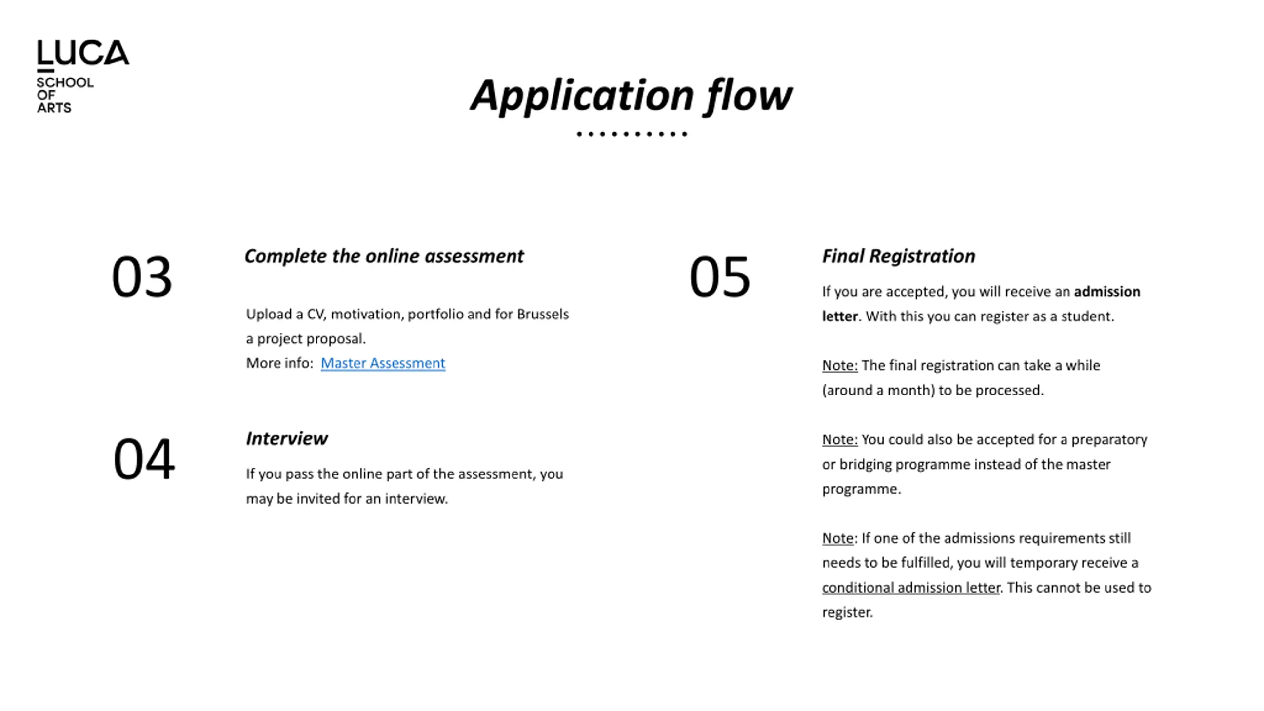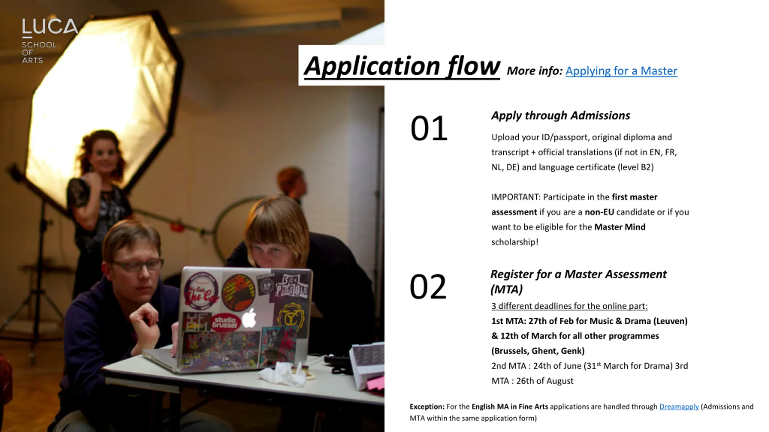 Application flow More info: Applying for a Master Apply through Admissions 01 Upload your ID/passport, original diploma and transcript+ official translations (if not in EN, FR, NL, DE) and language certificate (level B2) IMPORTANT: Participate in the first master assessment if you are a non-EU candidate or if you want to be eligible for the Master Mind scholarship! Register for a Master Assessment (MTA) 02 3 different deadlines for the online part: 1st MTA: 27th of Feb for Music & Drama (Leuven) & 12th of March for all other programmes (Brussels, Ghent, Genk) 2nd MTA : 24th of June (31st March for Drama) 3rd MTA : 26th of August Exception: For the English MA in Fine Arts applications are handled through Dreamapply (Admissions and MTA within the same application form)