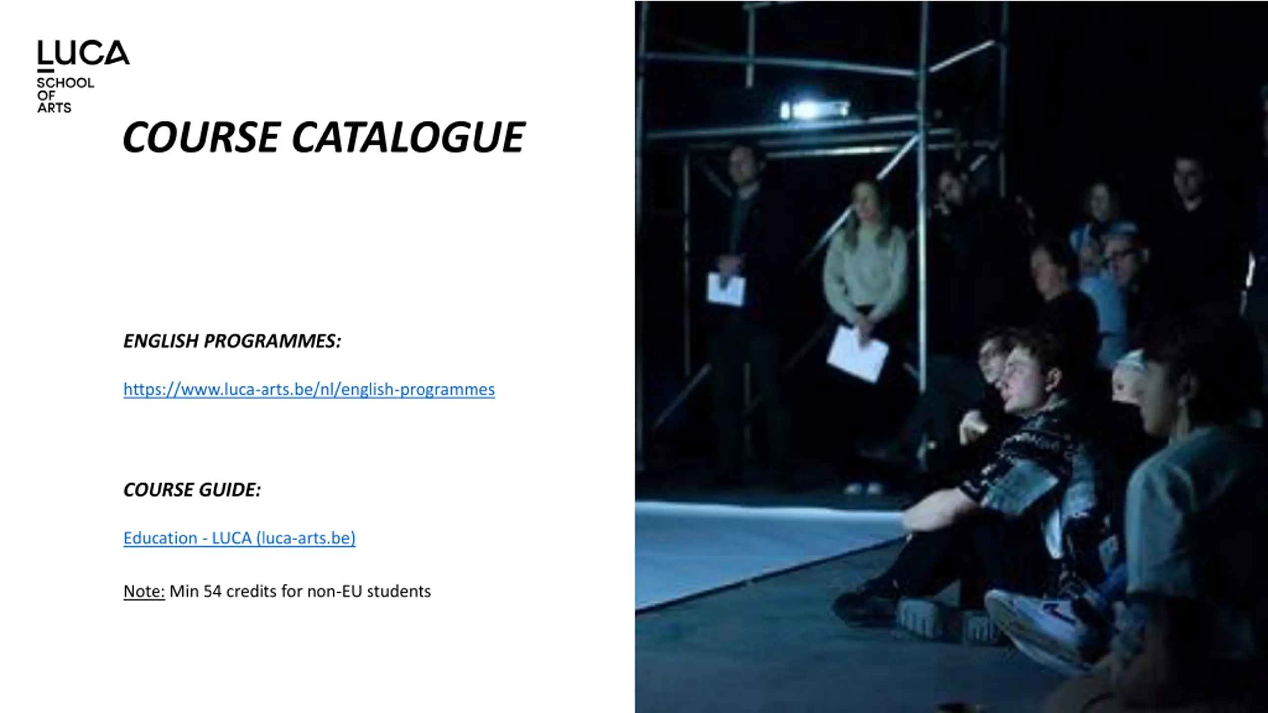 COURSE CATALOGUE ENGLISH PROGRAMMES: https://www.luca-arts.be/nl/english-programmes COURSE GUIDE: Education - LUCA (luca-arts.be) Note: Min 54 credits for non-EU students