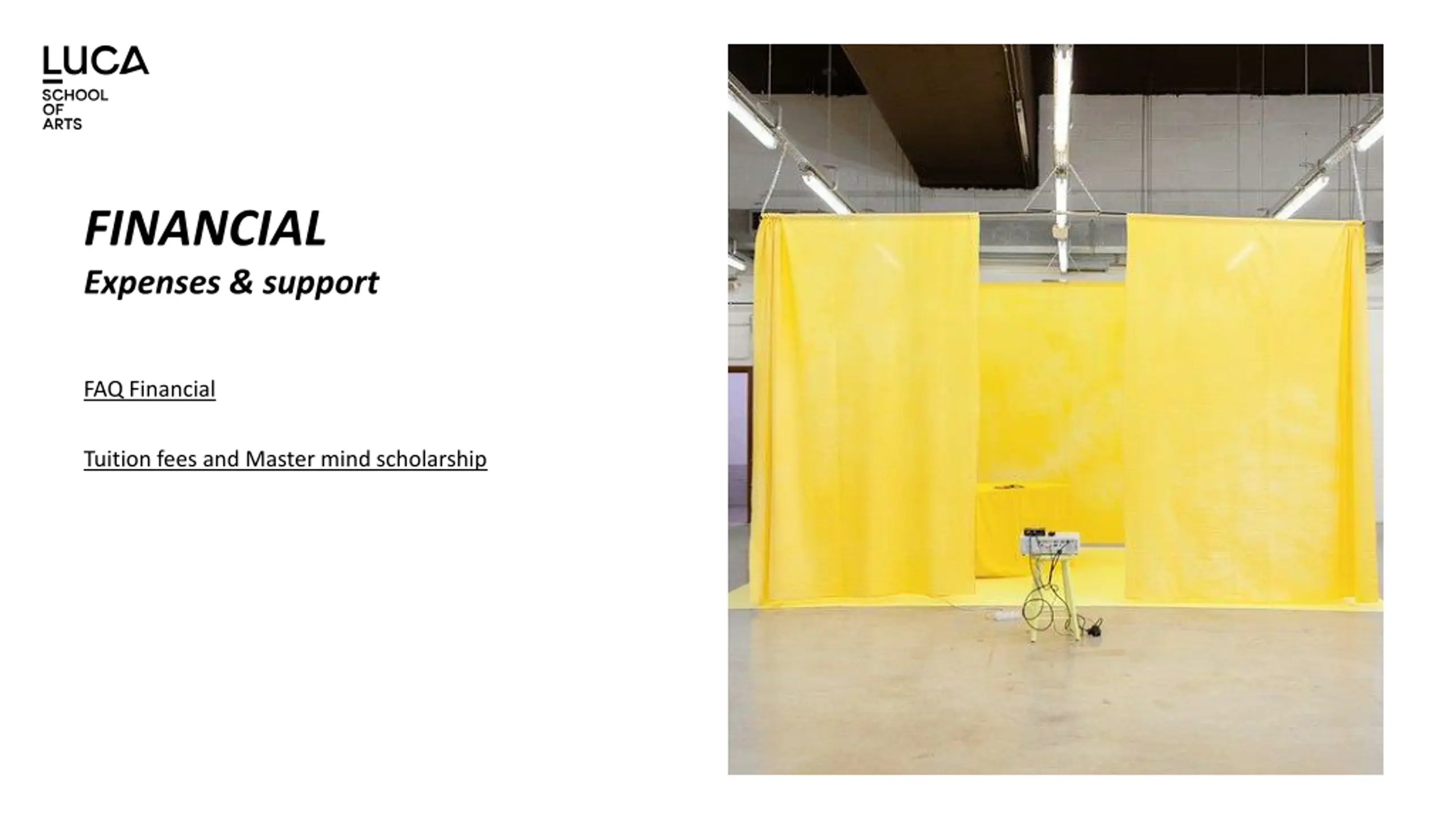 Financial No application fee Tuition fee: Total fee depends on the type of programme you are following and the number of credits you are enrolled for. EXPENSES F.e. As a non-EEA-student* or EEA-student applying for a full time (60ECTS/year) arts and design related degree, in 2025-2026* you'll need to pay: - the fixed amount of 299 - added with 60 credits (=the amount of credits you enrol in) x 14,30 = 1.157 / year. * For the Music and Erasmus Mundus programmes non-EEA students may need to pay a higher amount There is also an additional material cost which differs between studio's. The amount of this cost fluctuates between 200 and 400 / year. Living costs: Useful site: https://www.numbeo.com/cost-of-living/ Insurance: https://www.luca-arts.be/en/insurance-international-students-luca