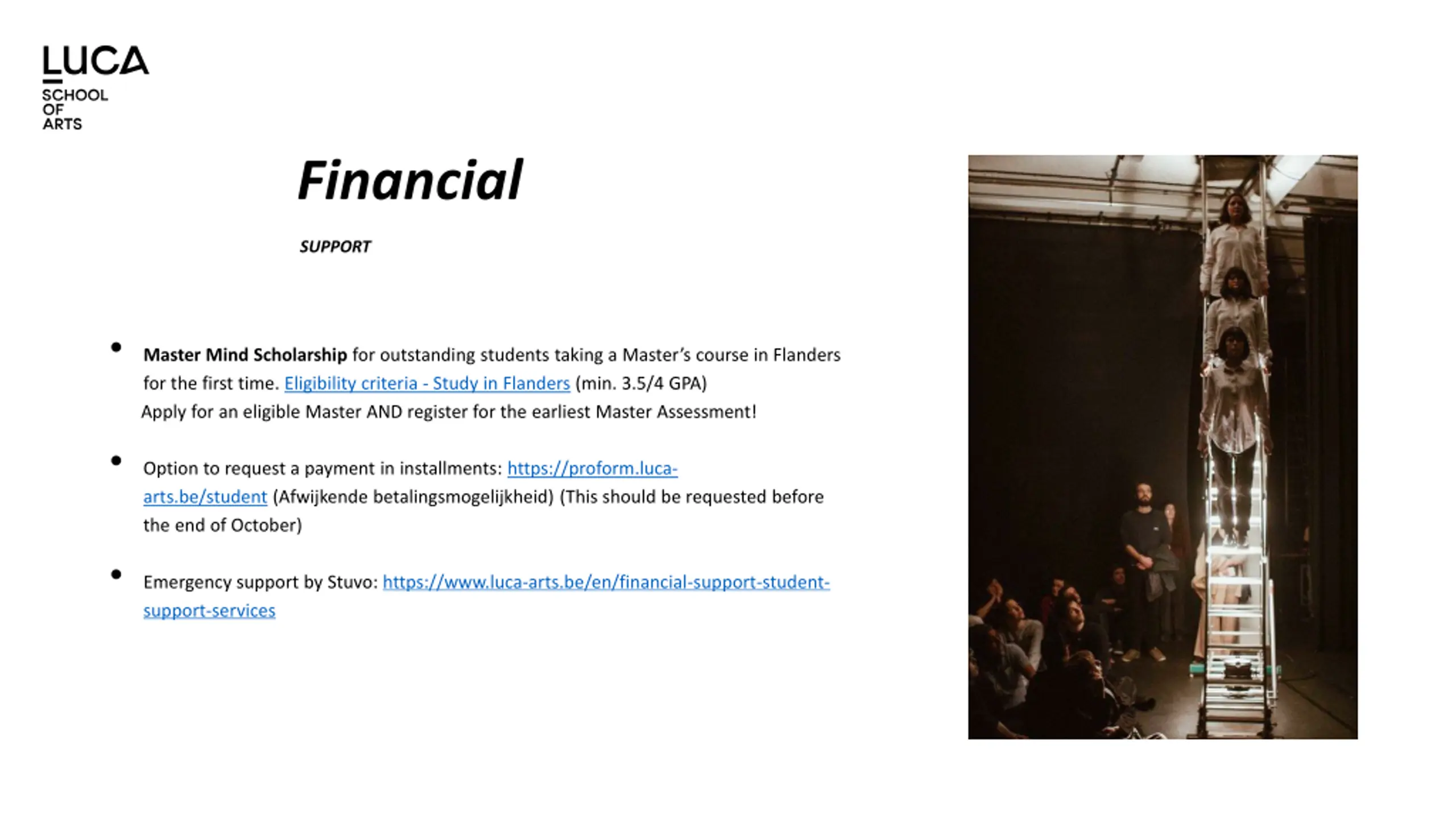 Financial SUPPORT Master Mind Scholarship for outstanding students taking a Master s course in Flanders for the first time. Eligibility criteria - Study in Flanders (min. 3.5/4 GPA) Apply for an eligible Master AND register for the earliest Master Assessment! Option to request a payment in installments: https://proform.luca- arts.be/student (Afwijkende betalingsmogelijkheid) (This should be requested before the end of October) Emergency support by Stuvo: https://www.luca-arts.be/en/financial-support-student- support-services
