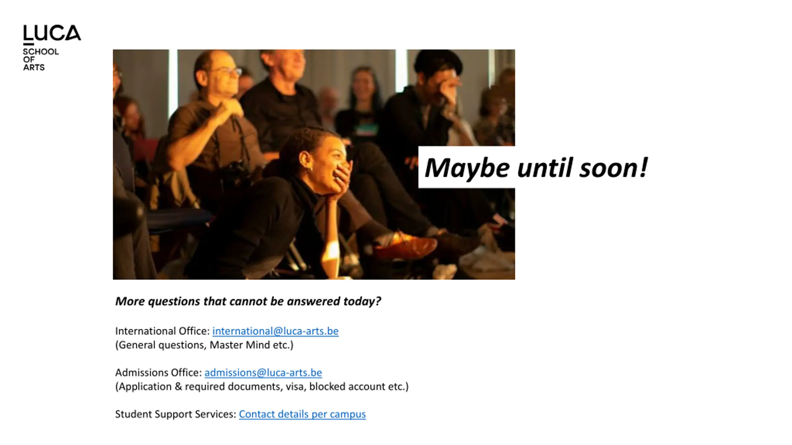 Maybe until soon! More questions that cannot be answered today? International Office: international@luca-arts.be (General questions, Master Mind etc.) Admissions Office: admissions@luca-arts.be (Application & required documents, visa, blocked account etc.) Student Support Services: Contact details per campus