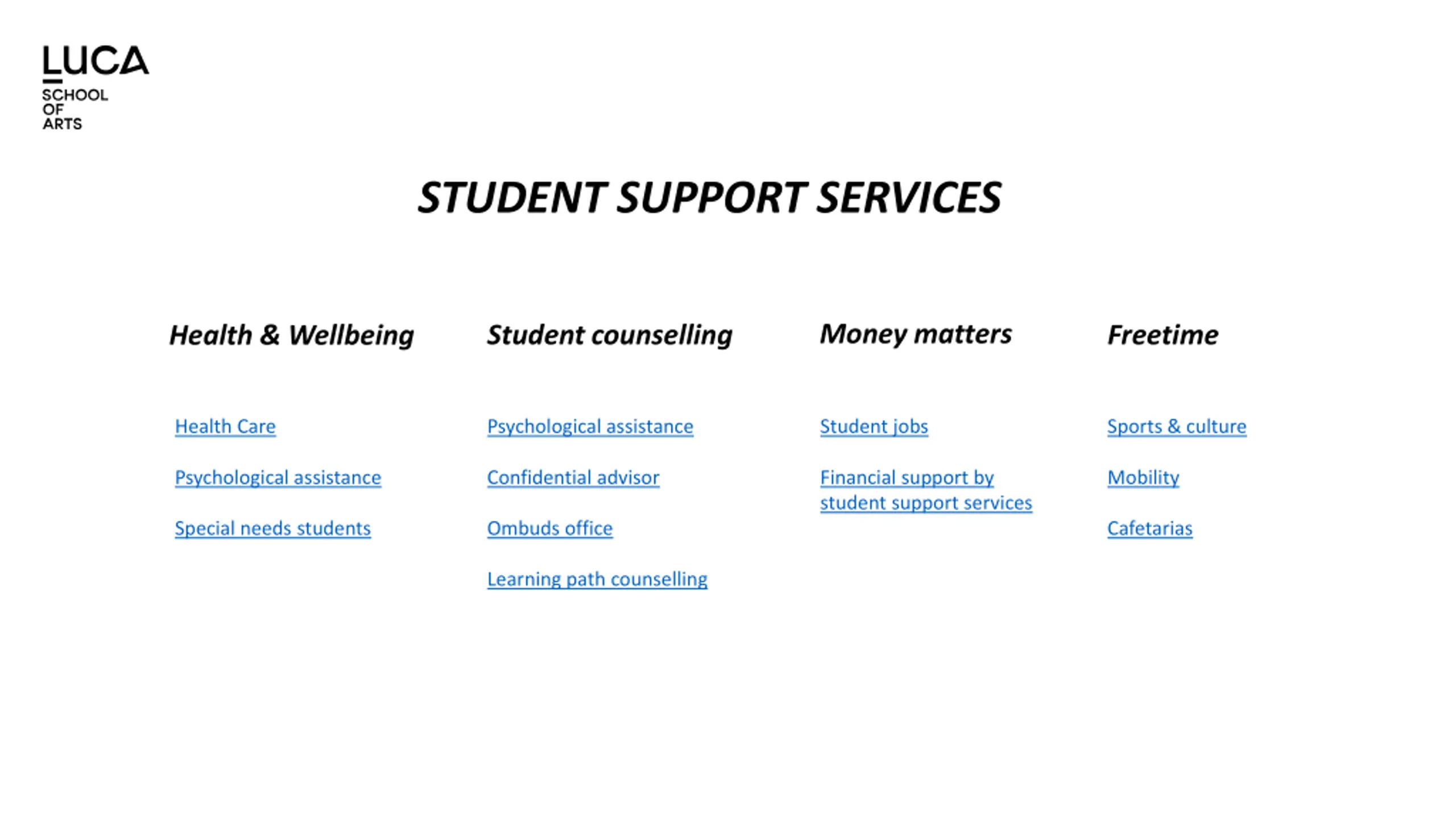 STUDENT SUPPORT SERVICES Money matters Student counselling Freetime Health & Wellbeing Health Care Psychological assistance Student jobs Sports & culture Psychological assistance Confidential advisor Financial support by student support services Mobility Special needs students Ombuds office Cafetarias Learning path counselling