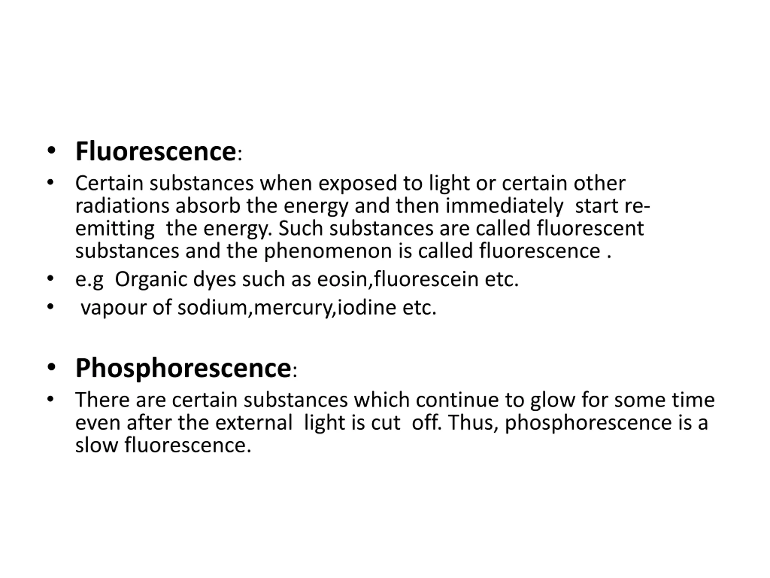 Fluorescence: Certain substances when exposed to light or certain other radiations absorb the energy and then immediately start re- emitting the energy. Such substances are called fluorescent substances and the phenomenon is called fluorescence . e.g Organic dyes such as eosin,fluorescein etc. vapour of sodium,mercury,iodine etc. Phosphorescence: There are certain substances which continue to glow for some time even after the external light is cut off. Thus, phosphorescence is a slow fluorescence.