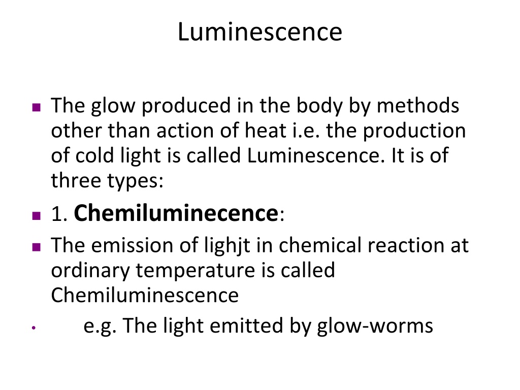 Luminescence The glow produced in the body by methods other than action of heat i.e. the production of cold light is called Luminescence. It is of three types: 1. Chemiluminecence: The emission of lighjt in chemical reaction at ordinary temperature is called Chemiluminescence e.g. The light emitted by glow-worms