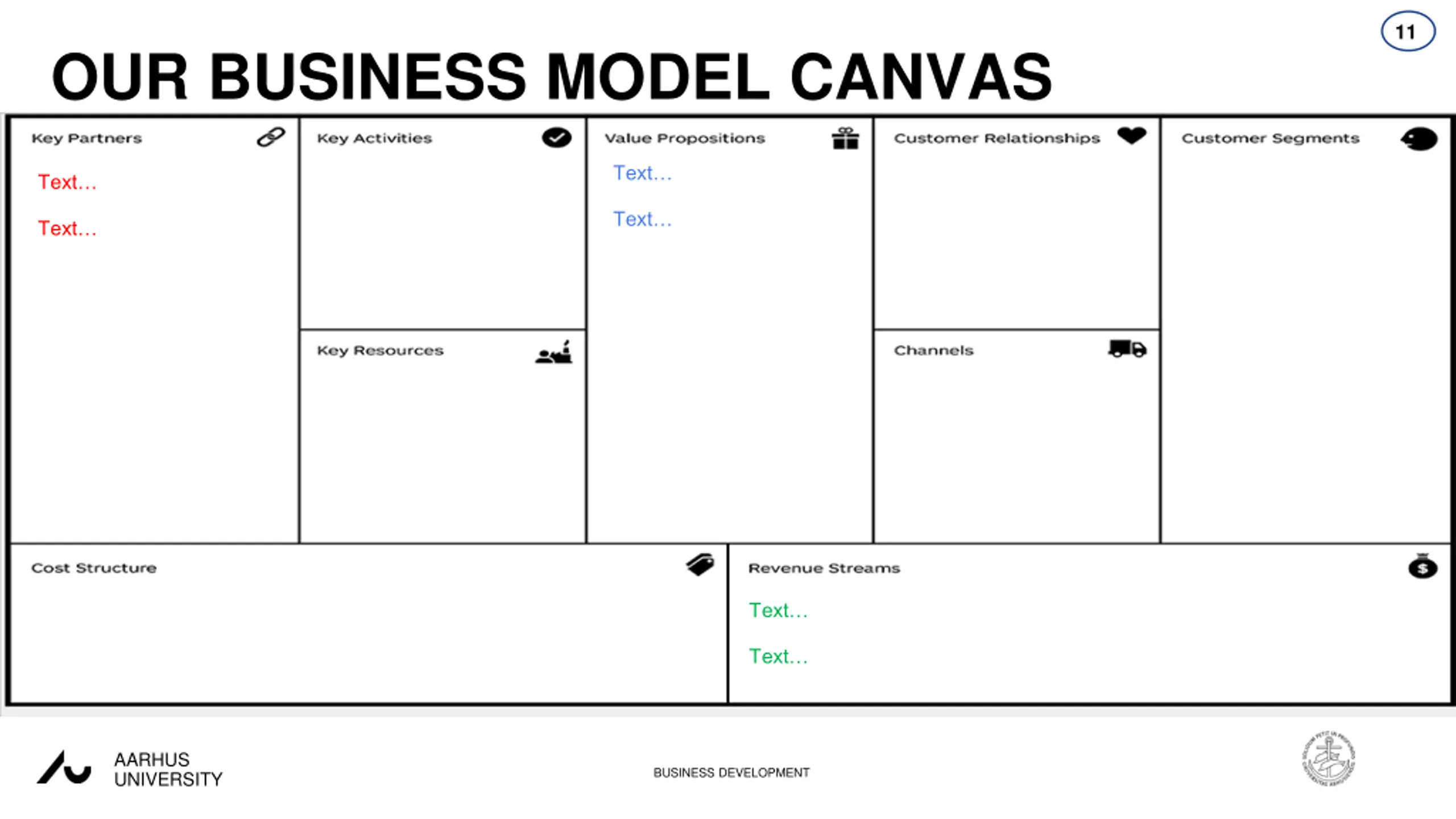 11 OUR BUSINESS MODEL CANVAS Text Text Text Text Text Text AARHUS UNIVERSITY BUSINESS DEVELOPMENT