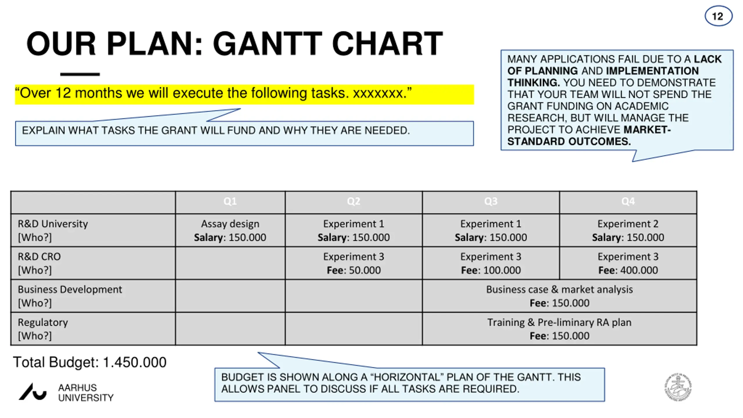 12 OUR PLAN: GANTT CHART MANY APPLICATIONS FAIL DUE TO A LACK OF PLANNING AND IMPLEMENTATION THINKING. YOU NEED TO DEMONSTRATE THAT YOUR TEAM WILL NOT SPEND THE GRANT FUNDING ON ACADEMIC RESEARCH, BUT WILL MANAGE THE PROJECT TO ACHIEVE MARKET- STANDARD OUTCOMES. Over 12 months we will execute the following tasks. xxxxxxx. EXPLAIN WHAT TASKS THE GRANT WILL FUND AND WHY THEY ARE NEEDED. Q1 Q2 Q3 Q4 R&D University [Who?] Assay design Salary: 150.000 Experiment 1 Salary: 150.000 Experiment 1 Salary: 150.000 Experiment 2 Salary: 150.000 R&D CRO [Who?] Experiment 3 Fee: 50.000 Experiment 3 Fee: 100.000 Experiment 3 Fee: 400.000 Business Development [Who?] Business case & market analysis Fee: 150.000 Regulatory [Who?] Training & Pre-liminary RA plan Fee: 150.000 Total Budget: 1.450.000 BUDGET IS SHOWN ALONG A HORIZONTAL PLAN OF THE GANTT. THIS ALLOWS PANEL TO DISCUSS IF ALL TASKS ARE REQUIRED. AARHUS UNIVERSITY BUSINESS DEVELOPMENT
