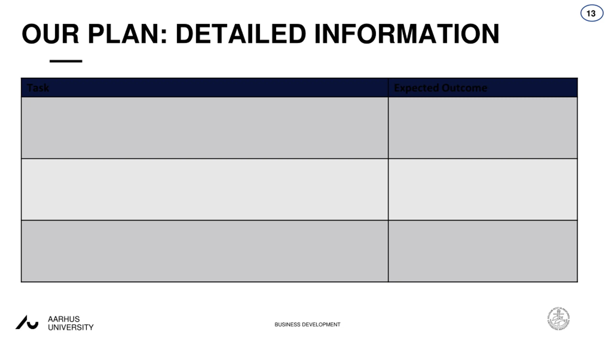 13 OUR PLAN: DETAILED INFORMATION Task Expected Outcome AARHUS UNIVERSITY BUSINESS DEVELOPMENT