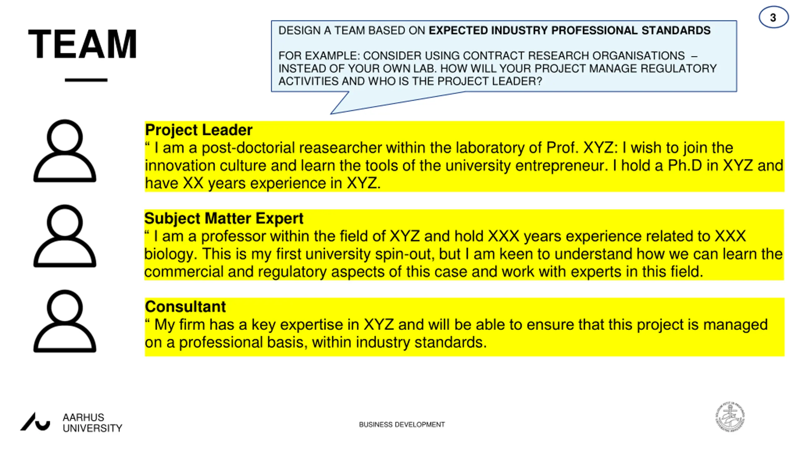 3 TEAM DESIGN A TEAM BASED ON EXPECTED INDUSTRY PROFESSIONAL STANDARDS FOR EXAMPLE: CONSIDER USING CONTRACT RESEARCH ORGANISATIONS INSTEAD OF YOUR OWN LAB. HOW WILL YOUR PROJECT MANAGE REGULATORY ACTIVITIES AND WHO IS THE PROJECT LEADER? Project Leader I am a post-doctorial reasearcher within the laboratory of Prof. XYZ: I wish to join the innovation culture and learn the tools of the university entrepreneur. I hold a Ph.D in XYZ and have XX years experience in XYZ. Subject Matter Expert I am a professor within the field of XYZ and hold XXX years experience related to XXX biology. This is my first university spin-out, but I am keen to understand how we can learn the commercial and regulatory aspects of this case and work with experts in this field. Consultant My firm has a key expertise in XYZ and will be able to ensure that this project is managed on a professional basis, within industry standards. AARHUS UNIVERSITY BUSINESS DEVELOPMENT