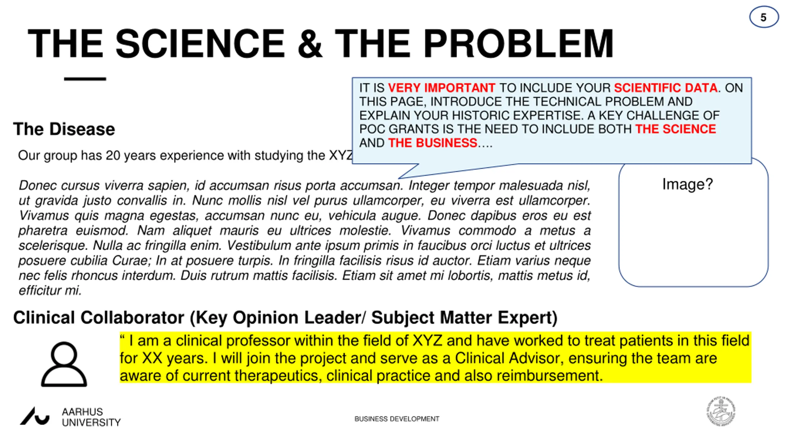 5 THE SCIENCE & THE PROBLEM IT IS VERY IMPORTANT TO INCLUDE YOUR SCIENTIFIC DATA. ON THIS PAGE, INTRODUCE THE TECHNICAL PROBLEM AND EXPLAIN YOUR HISTORIC EXPERTISE. A KEY CHALLENGE OF POC GRANTS IS THE NEED TO INCLUDE BOTH THE SCIENCE AND THE BUSINESS . The Disease Our group has 20 years experience with studying the XYZ pathway. Recently, Image? Donec cursus viverra sapien, id accumsan risus porta accumsan. Integer tempor malesuada nisl, ut gravida justo convallis in. Nunc mollis nisl vel purus ullamcorper, eu viverra est ullamcorper. Vivamus quis magna egestas, accumsan nunc eu, vehicula augue. Donec dapibus eros eu est pharetra euismod. Nam aliquet mauris eu ultrices molestie. Vivamus commodo a metus a scelerisque. Nulla ac fringilla enim. Vestibulum ante ipsum primis in faucibus orci luctus et ultrices posuere cubilia Curae; In at posuere turpis. In fringilla facilisis risus id auctor. Etiam varius neque nec felis rhoncus interdum. Duis rutrum mattis facilisis. Etiam sit amet mi lobortis, mattis metus id, efficitur mi. Clinical Collaborator (Key Opinion Leader/ Subject Matter Expert) I am a clinical professor within the field of XYZ and have worked to treat patients in this field for XX years. I will join the project and serve as a Clinical Advisor, ensuring the team are aware of current therapeutics, clinical practice and also reimbursement. AARHUS UNIVERSITY BUSINESS DEVELOPMENT