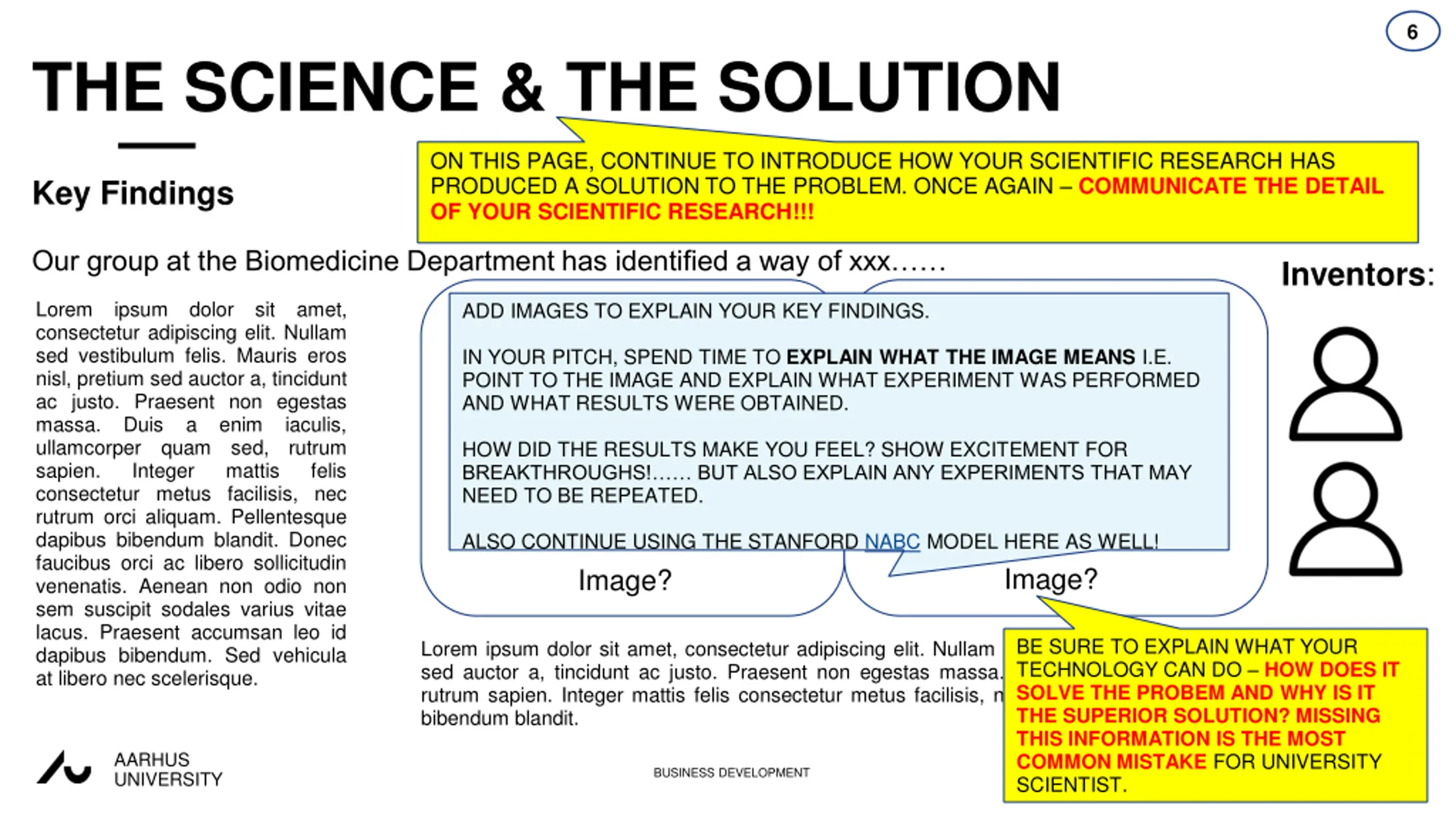 6 THE SCIENCE & THE SOLUTION ON THIS PAGE, CONTINUE TO INTRODUCE HOW YOUR SCIENTIFIC RESEARCH HAS PRODUCED A SOLUTION TO THE PROBLEM. ONCE AGAIN COMMUNICATE THE DETAIL OF YOUR SCIENTIFIC RESEARCH!!! Key Findings Our group at the Biomedicine Department has identified a way of xxx Inventors: Lorem consectetur adipiscing elit. Nullam sed vestibulum felis. Mauris eros nisl, pretium sed auctor a, tincidunt ac justo. Praesent non egestas massa. Duis a ullamcorper quam sapien. Integer consectetur metus facilisis, nec rutrum orci aliquam. Pellentesque dapibus bibendum blandit. Donec faucibus orci ac libero sollicitudin venenatis. Aenean non odio non sem suscipit sodales varius vitae lacus. Praesent accumsan leo id dapibus bibendum. Sed vehicula at libero nec scelerisque. ipsum dolor sit amet, ADD IMAGES TO EXPLAIN YOUR KEY FINDINGS. IN YOUR PITCH, SPEND TIME TO EXPLAIN WHAT THE IMAGE MEANS I.E. POINT TO THE IMAGE AND EXPLAIN WHAT EXPERIMENT WAS PERFORMED AND WHAT RESULTS WERE OBTAINED. enim sed, mattis iaculis, rutrum felis HOW DID THE RESULTS MAKE YOU FEEL? SHOW EXCITEMENT FOR BREAKTHROUGHS! BUT ALSO EXPLAIN ANY EXPERIMENTS THAT MAY NEED TO BE REPEATED. ALSO CONTINUE USING THE STANFORD NABC MODEL HERE AS WELL! Image? Image? BE SURE TO EXPLAIN WHAT YOUR TECHNOLOGY CAN DO HOW DOES IT SOLVE THE PROBEM AND WHY IS IT THE SUPERIOR SOLUTION? MISSING THIS INFORMATION IS THE MOST COMMON MISTAKE FOR UNIVERSITY SCIENTIST. Lorem ipsum dolor sit amet, consectetur adipiscing elit. Nullam sed vestibulum felis. Mauris eros nisl, pretium sed auctor a, tincidunt ac justo. Praesent non egestas massa. Duis a enim iaculis, ullamcorper quam sed, rutrum sapien. Integer mattis felis consectetur metus facilisis, nec rutrum orci aliquam. Pellentesque dapibus bibendum blandit. AARHUS UNIVERSITY BUSINESS DEVELOPMENT