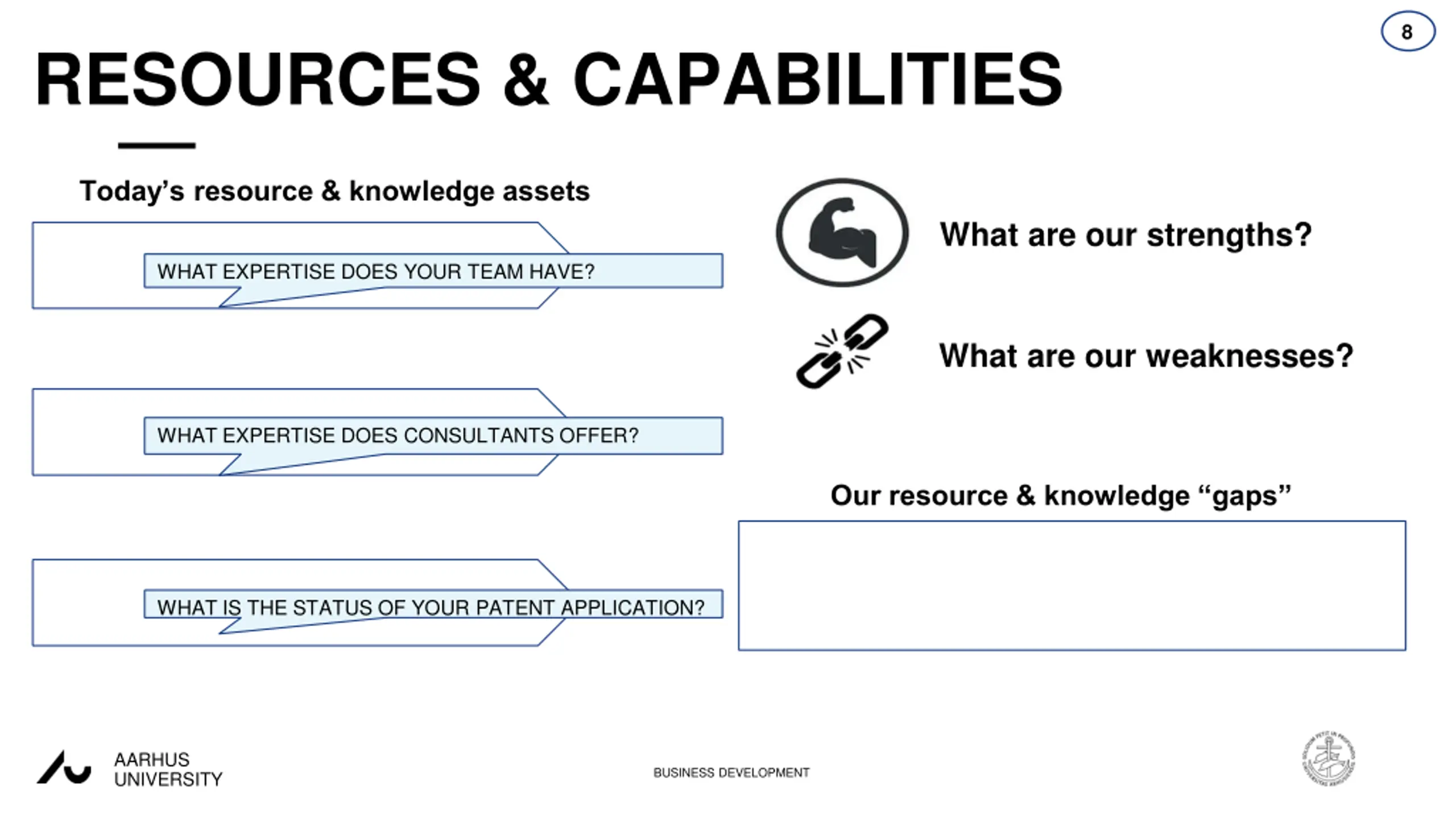 8 RESOURCES & CAPABILITIES Today s resource & knowledge assets What are our strengths? WHAT EXPERTISE DOES YOUR TEAM HAVE? What are our weaknesses? WHAT EXPERTISE DOES CONSULTANTS OFFER? Our resource & knowledge gaps WHAT IS THE STATUS OF YOUR PATENT APPLICATION? AARHUS UNIVERSITY BUSINESS DEVELOPMENT